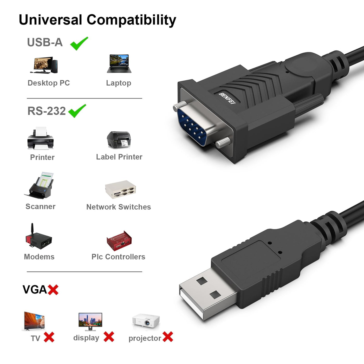 Benfei Usb To Serial Adapter, Usb To Rs 232 Male (9 Pin) Db9 Serial Cable, Prolific Chipset, Windows 11/10/8.1/8/7, Mac Os X 10.