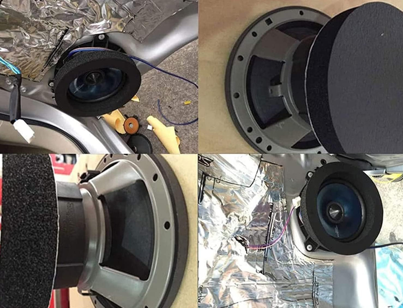 Q: How do the foam bass blockers improve sound quality?A: These foam bass blockers absorb rear waves and reduce front and rear wave cancellation, leading to improved sound clarity and a better overall listening experience in your vehicle.