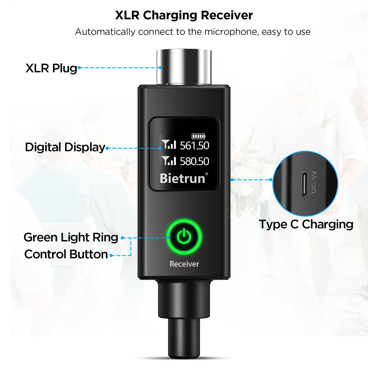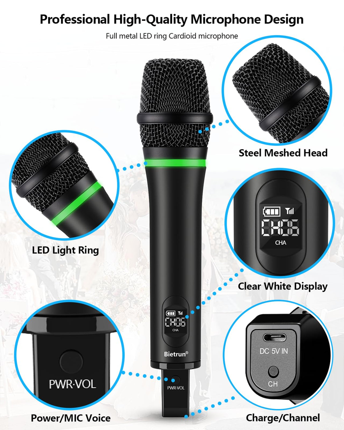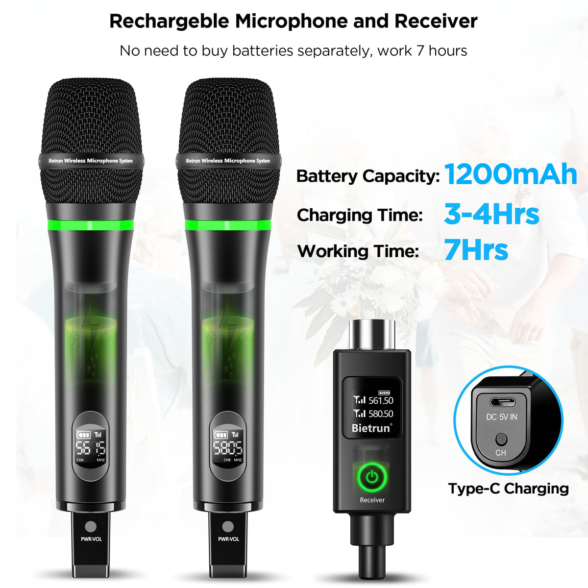 Bietrun Wireless Xlr Microphone, Rechargeable Professional Dual Metal Cordless Handheld Dynamic Mics System For Mixer, Audio Interface, Pa Amplifier System, Church, Singing, Karaoke(Uhf 240Ft Range)