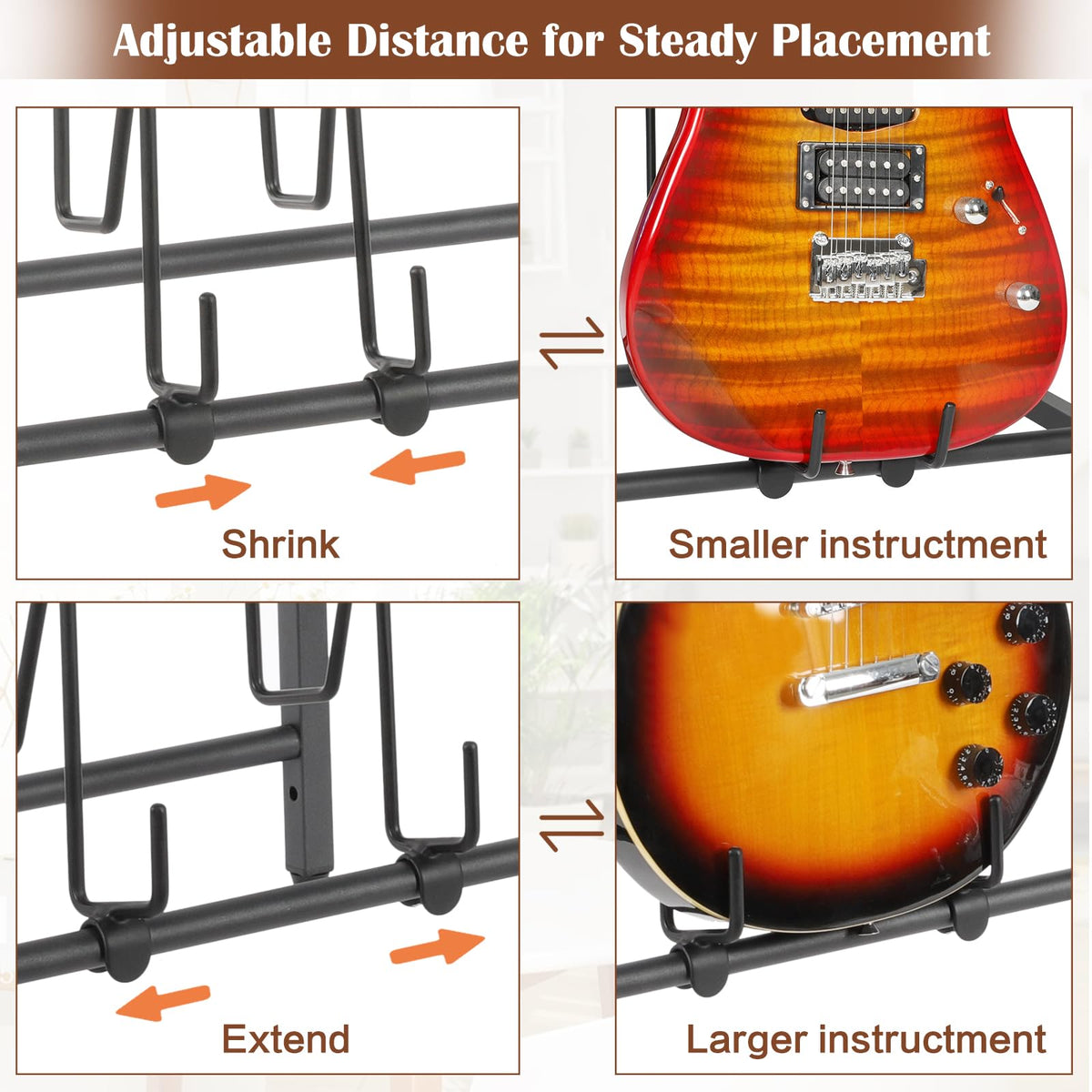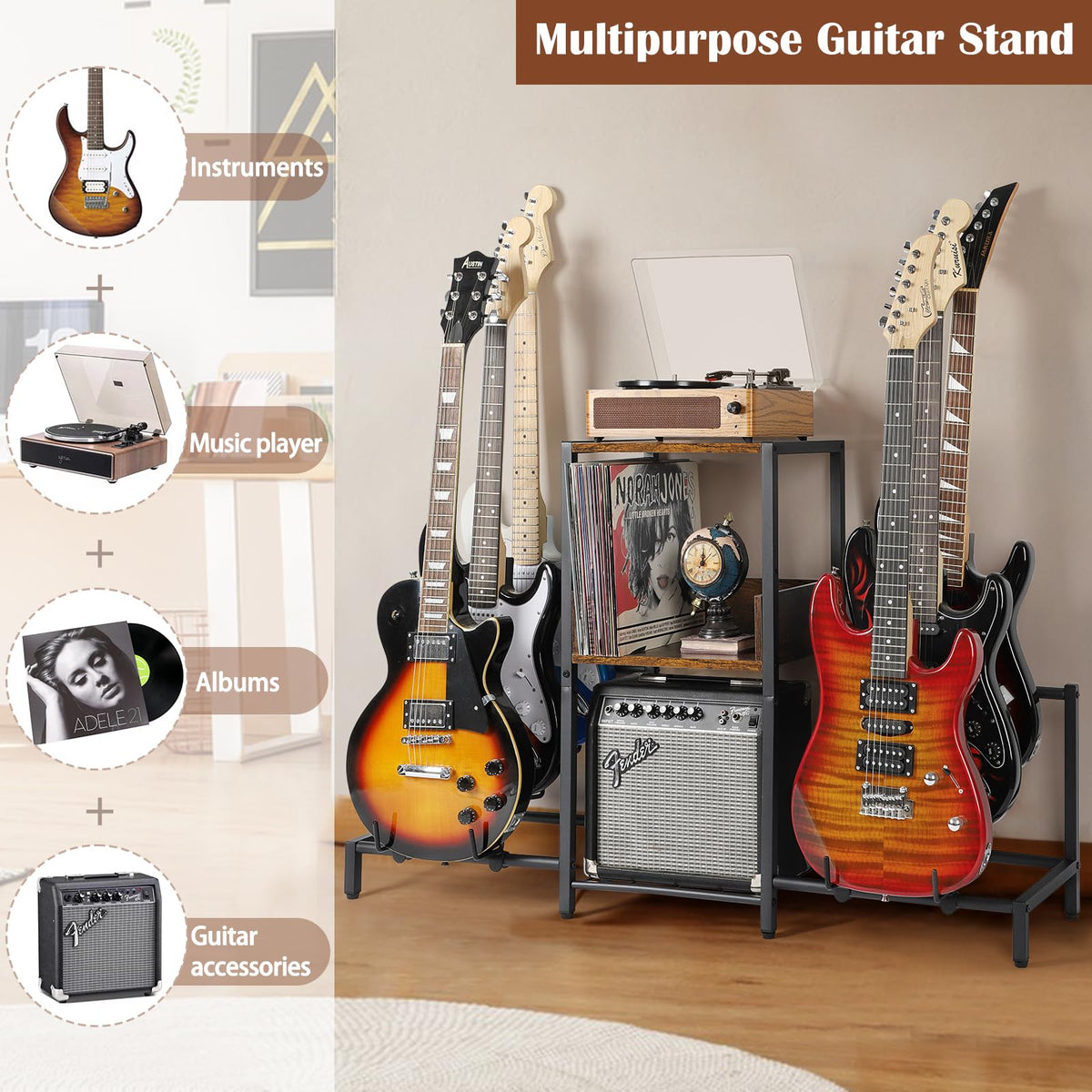 Guitar Stand For Multiple Guitars: It Can Hold Different Insturments Vertically, Including Electric Guitars And Bass. At Most For 6 Guitars. Its Wider Cradle Arms Acommodate Most Guitar Shapes. This Guitar Holder Stand Would Be Perfect Solution For Anyone To Display Their Guitars And Make Them Easily Accessible. Protect And Flexible: To Protect The Guitars Finish At All Contact Points, The Holder Arms Are Made Of Thick Rubber Cover And Steel Components. You Can Adjust The Distance Between The Two Holder Arms Easily, So It Won'T Wobble When Placing Guitars On The Rack. In Addition, There Is No Problems For The Insturments Angle To Upright Position.&Nbsp; With 3-Tier Storage Shelf: The Storage Shelf Stand Can Help You Keep Vinyl Record Player, Vinyl Records, Albums, Guitar Amp And Guitar Accessories. It Is Composed Of High-Quality Metal And Hard Thick Wood. Combining The 3-Tier Storage Stand, It Has Two Options To Install The Guitar Stands. More Convenience And Enjoyment. Ideal Guitar Stand Floor: This Floor Guitar Stand Features A Higher&Nbsp;Position&Nbsp;From The Ground. No More Worry About If The Insturments Would Hit The Floor. Non-Slip Feet Are Designed For Keeping The Stand Sturdy On The Floor. It Is Safe And Ideal Choice To Store Your Guitars For Home, Music Room And Studio. Good-Looking And Save Space.&Nbsp; Kits Included: The Total Size Is 29''H X 12''W X 47''L. All Parts And Hardware Are Included. Just Following The Instrution, It Is Easy To Finish The Installation. An Great Gift For Family And Friend On Christmas, Thanksgiving. Any Questions, Please Feel Free To Reach Out.