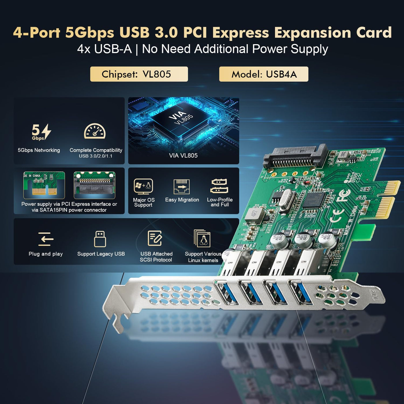 Binardat Pcie To 4 Ports Usb 3.0 Expansion Card, Self Powered, Low Profile Bracket, Usb3 Hub Controller Adapter For Windows 10/1