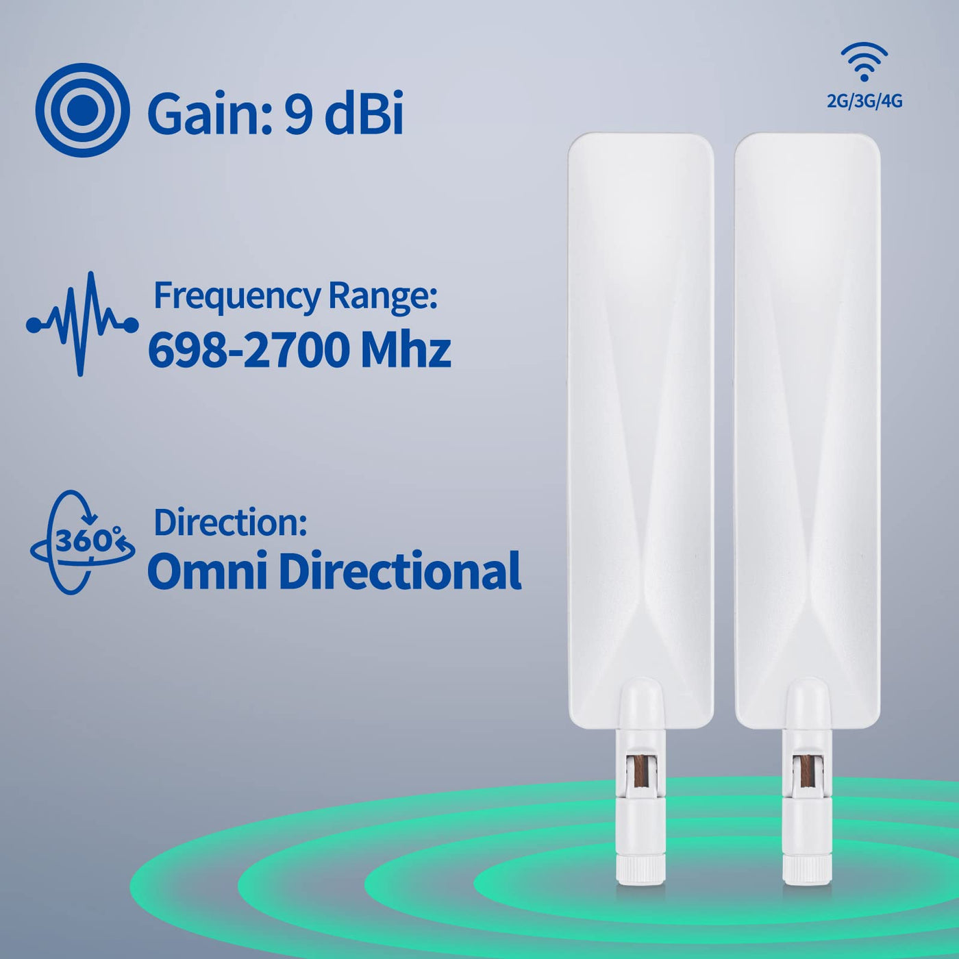 Specifications: Gain: 9Dbi Frequency Range: 698-960 Mhz, 1710-2170 Mhz, 2300-2700 Mhz Vswr: < 2.0; Polarization: Linear Vertical; Impedance: 50 Ohm; Direction: Omni-Directional; Connector: Sma Male Connector; Net Weight: 65G; Operating Temperature: -20? ~ +80? Storage Temperature: -30? ~ +85? Package List: 2 X Antenna (As The Picture Shown) Compatible With: 4G Lte Mobile Router, Mobile Broadband Modem Hotspot, Cpe Router, Cellular Gateway; Home Office Indoor, Vehicle Car Truck Rv Bus Van Mobile Cellular; 4G Lte Cellular Trail Camera, Game Camera, Outdoor Security Camera; 4G Lte Security Camera, Celluar Surveillance Camera; Vehicle 4G Lte Tracker, Real Time Monitor, Mobile Vehicle Car Dvr Mdvr Video Recorder; Industrial 4G Lte Router, Cellular Iot Gateway, 4G Lte M2M Rtu Dtu Terminal, Cellular Embedded Module, Remote Metering And Sms Alarm, Remote Scada Daq Module, Remote Relay Gate Opener Switch, Vending Machine, Digital Signage, Delivery Locker, Cellular Temperature Humidity Sensor Monitoring System, Gsm Alarm System, Wireless Security Sensor Motion Detector Alert;