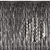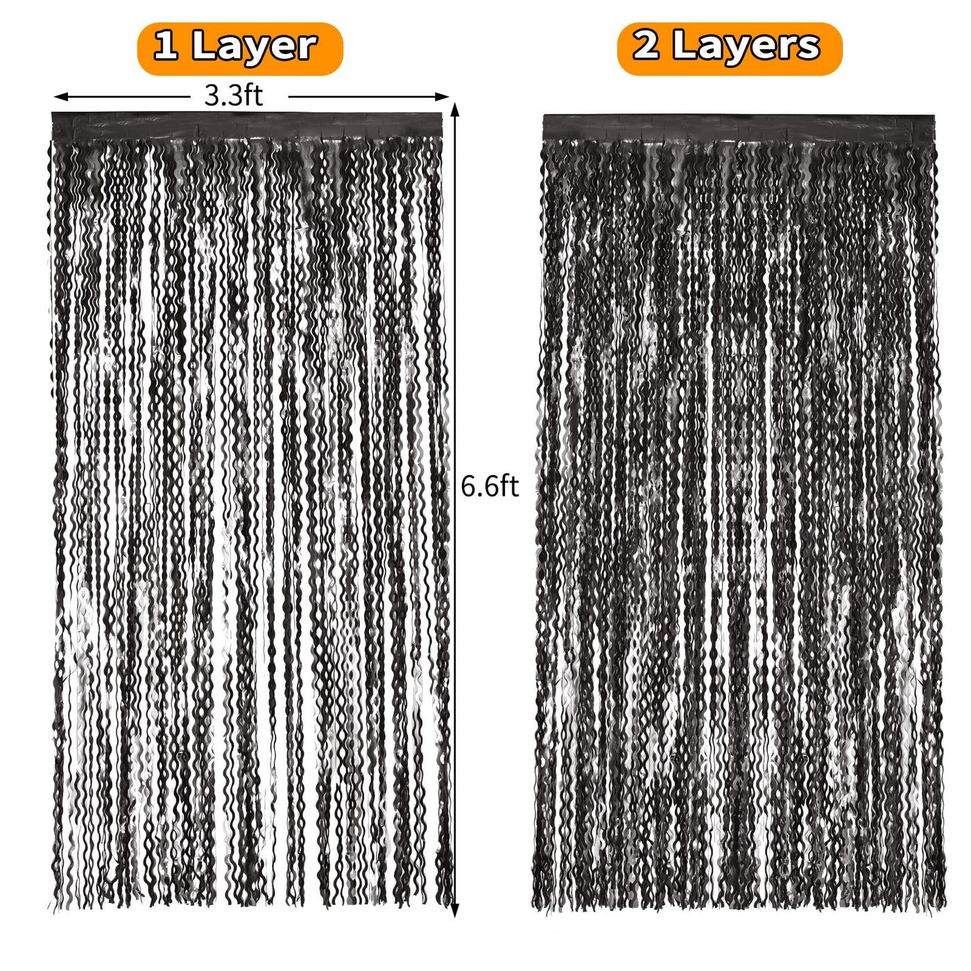 Q: What are the dimensions of the Black Foil Fringe Curtains?A: Each curtain measures 3.3 feet in width and 6.6 feet in height, making them ideal for various decoration needs.