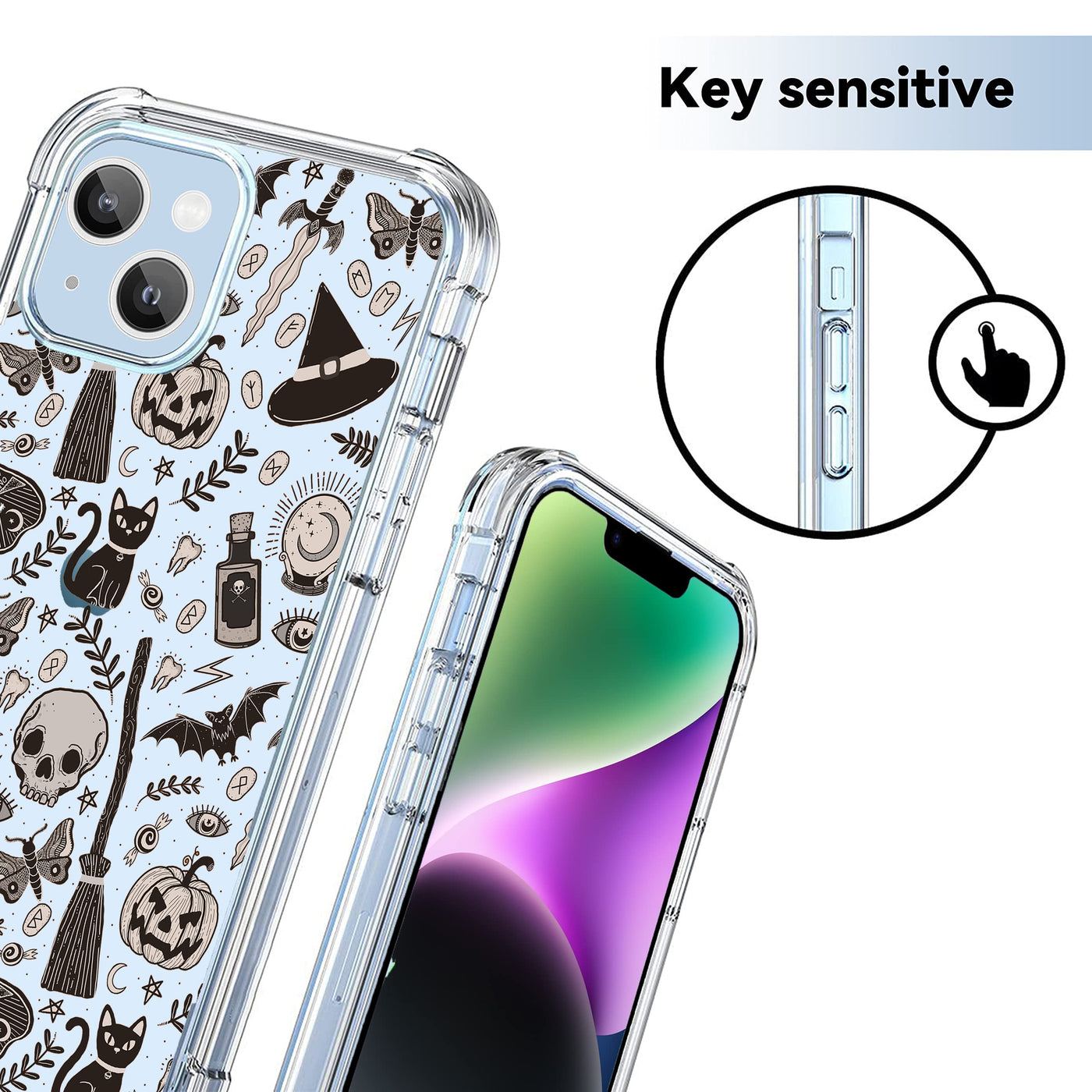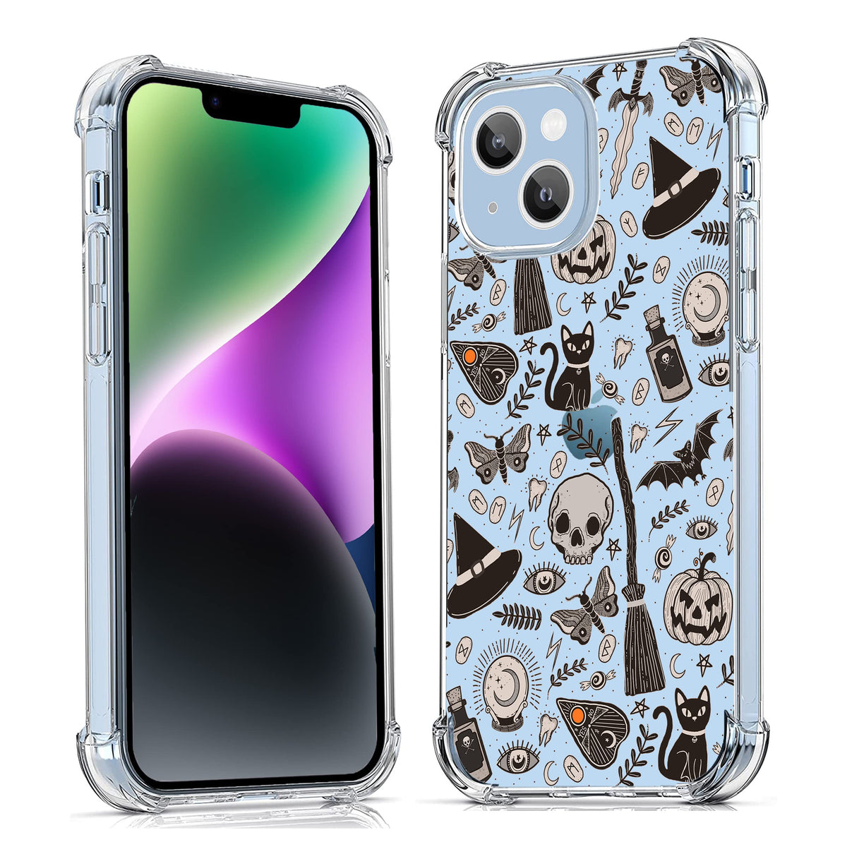 Black Halloween Clear Case For Iphone 14 Plus,Pumpkin Skull Bat Pattern For Men Women,Trendy Transparent Soft Tpu Bumper Case Fo