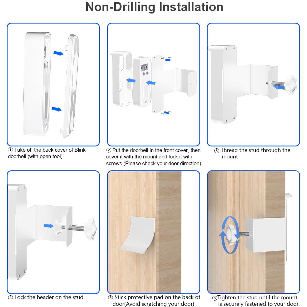 Q: Can I install the Blink Doorbell Mount without drilling?A: Yes, this mount is designed as a no-drill solution. It uses a protective pad to secure the mount without damaging your door, making it ideal for renters.
