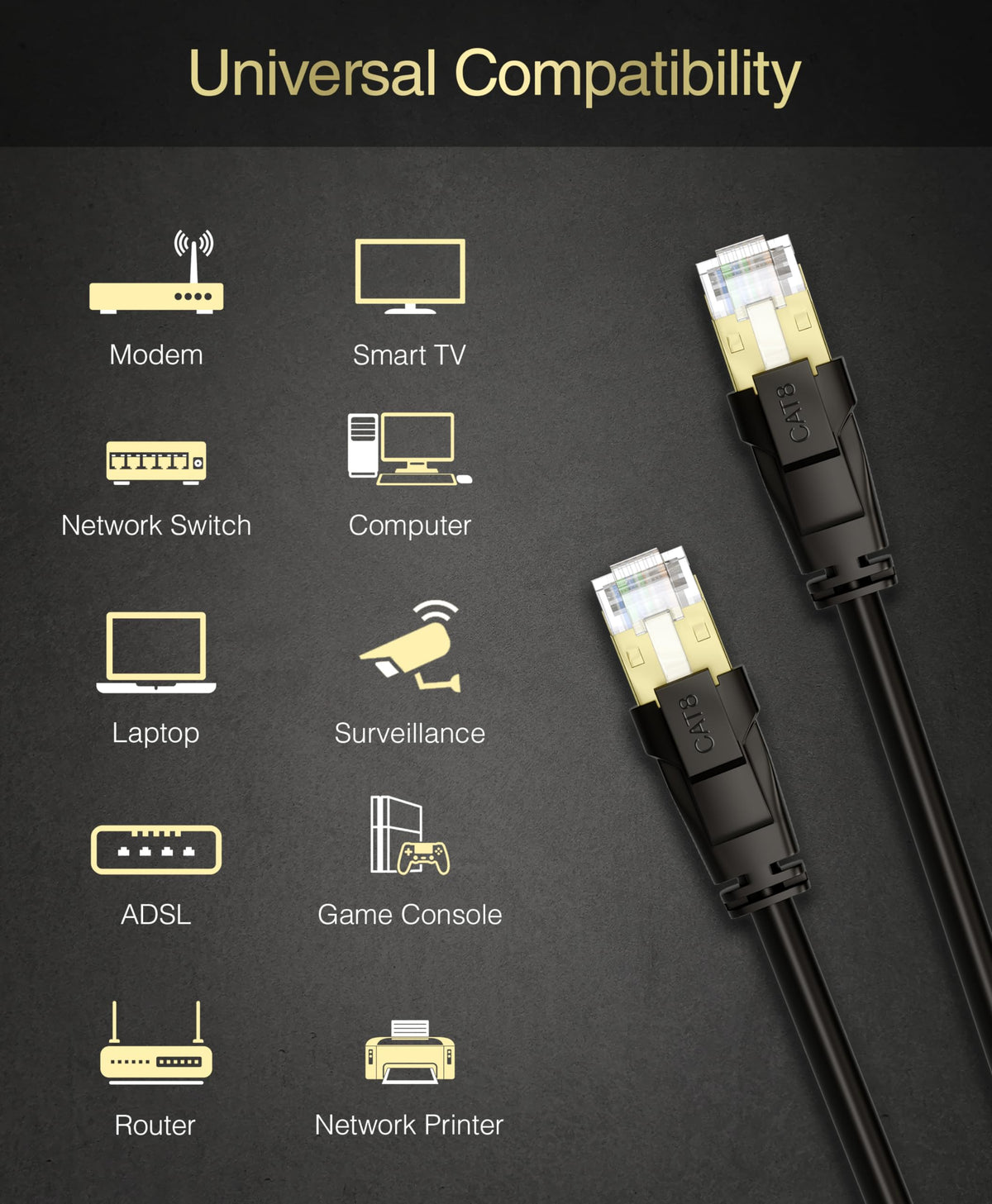 ? Cat8 Gigabit Ethernet Cable: Bluerigger Cat 8 Gigabit Network Lan Cable Supports Up To 40Gbps Data Transfer And 2000Mhz Bandwidth. Connect Your Lan/Wan Segments And Networking Gear At Maximum Speed | ? Universal Compatibility: Compatible With Game Consoles, Laptops, Pcs, Raspberry Pi 4, Routers, Wifi Extenders, Wi-Fi Mesh, Network Switch, Poe Devices, Smart Tv, Bt Smart Hub, Network Adapters, Patch Panel, Network Printers, Tv Box, Nas, Voip Phones With Rj45 Input | ? Extraordinary Performance: Superfast Data Transfer For Server Applications, Cloud Computing, Online High Definition Video Streaming, Video Surveillance And More. Compatible With Ai Smart Products Such As Alexa, Google Home, Apple Siri That Require High Speed Network | ? Superior Build: Double Aluminum Shielded Twisted Pairs (Stp) And 100% Pure Copper Help Minimize Interference. Snagless Design, 26Awg Cable Thickness, Strain-Relief Boots And 50 Micron Gold Plated Rj45 Connectors Provide Durability And Ensure A Secure Connection | ? Warranty & Testing: Tia, Reach, Rohs Compliant. Bluerigger Lifetime Warranty And Us-Based Customer Support