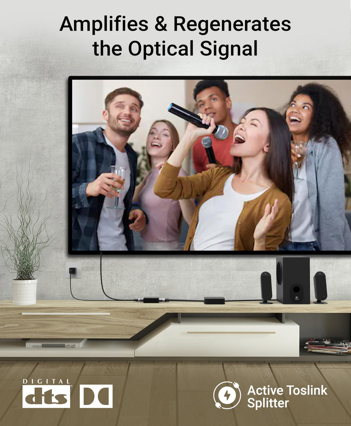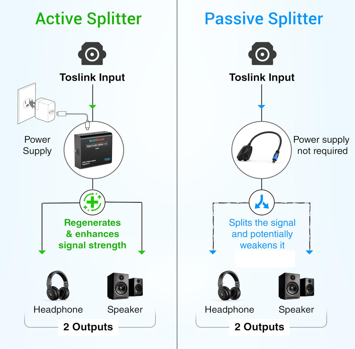 Bluerigger Digital Optical Audio Splitter (Active Toslink Splitter 1 In 2 Out, Spdif, Fiber Optic Adapter) - Compatible With Hom