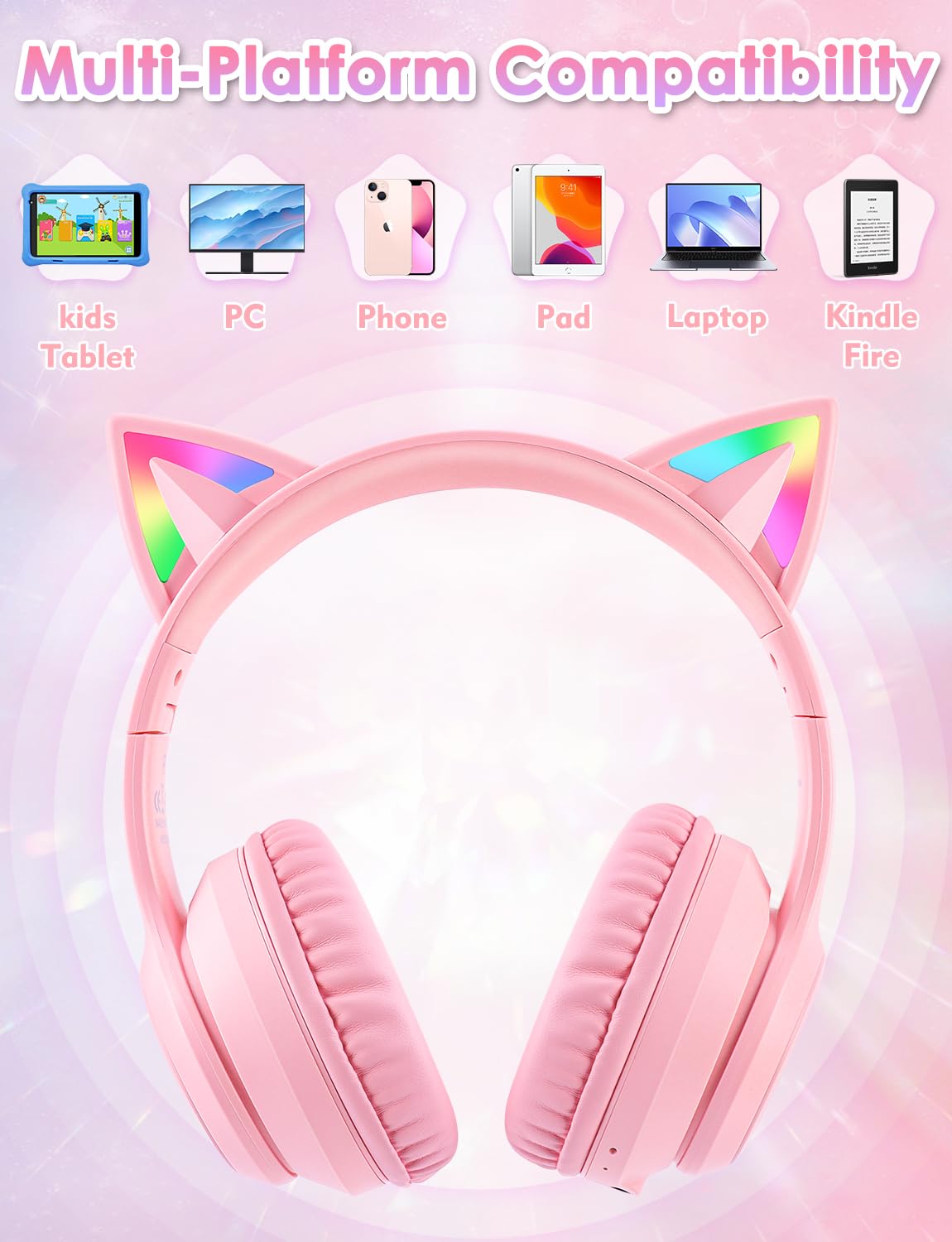 Bluetooth Kids Headphones With Microphone, Cat Ear Led Light Up And 85Db Volume Limited Toddlers Study Headphones, Wireless Fold
