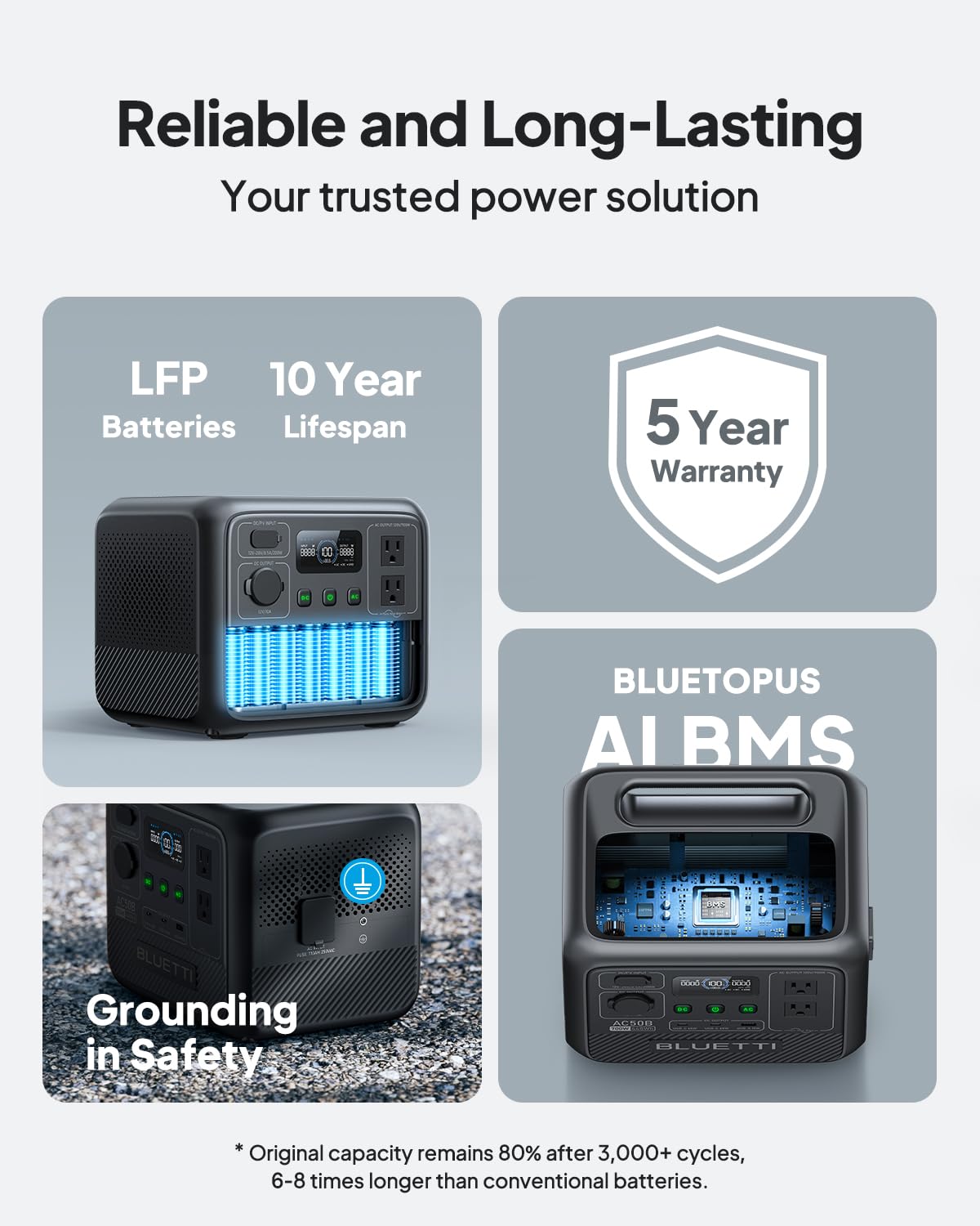 Q: Is the BLUETTI AC50B safe for indoor use?A: Yes, the AC50B is designed with safety in mind, featuring LiFePO4 batteries that have a lifespan of over 3500 cycles and built-in BLUETTI AI-BMS to prevent overcharging and short circuits, making it safe for indoor use.