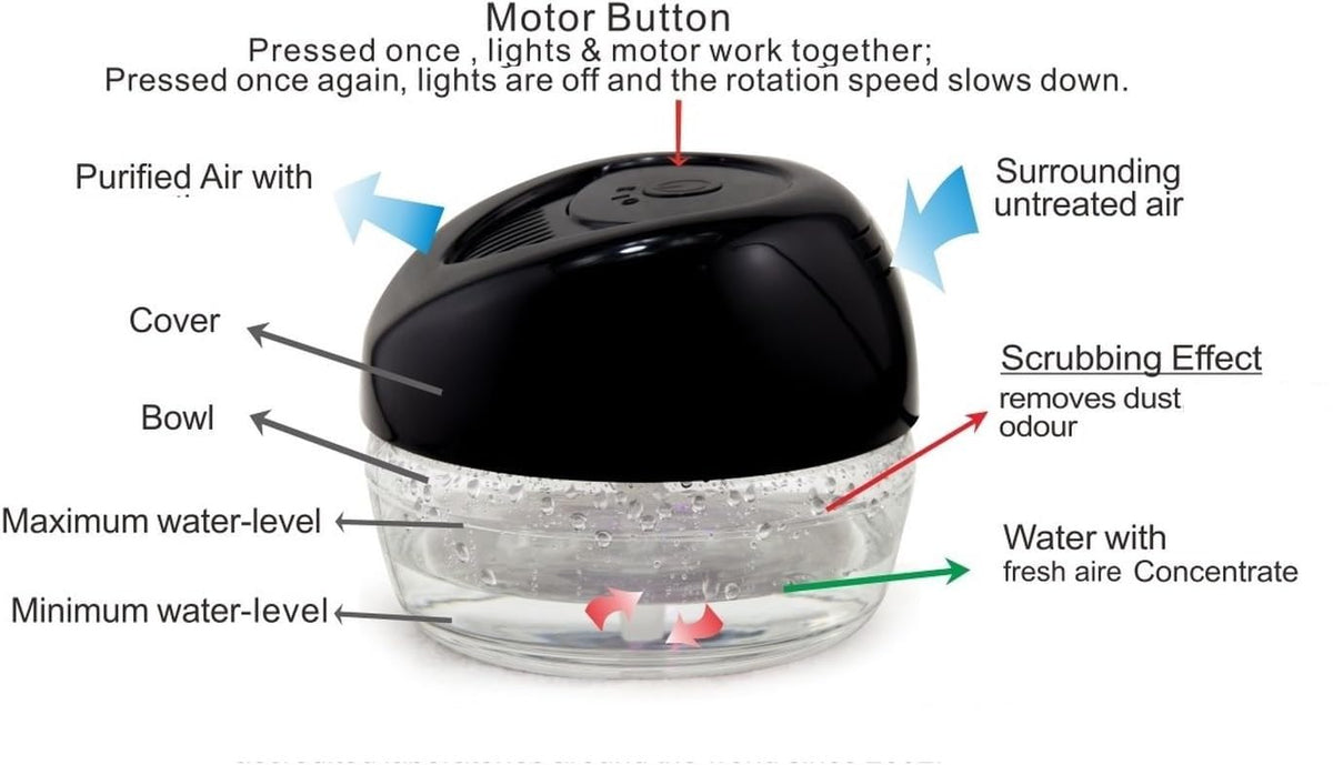 Q: How does the Bluonics Fresh Aire water air washer work?A: The Bluonics Fresh Aire water air washer operates by utilizing water as a natural filter to trap airborne particles, while simultaneously releasing fresh, moist air back into your space. This water-based air purifier enhances air quality by revitalizing and humidifying the environment.