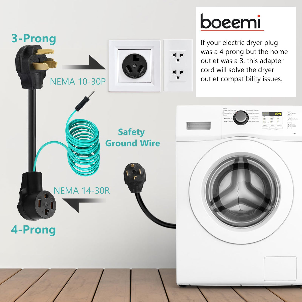 Q: How easy is it to install the BOEEMI dryer adapter?A: Installing the BOEEMI dryer adapter is a straightforward process that requires no tools or electrical knowledge. Simply plug it into the 3 prong outlet and connect your dryer, making it an ideal solution for renters or DIY enthusiasts.