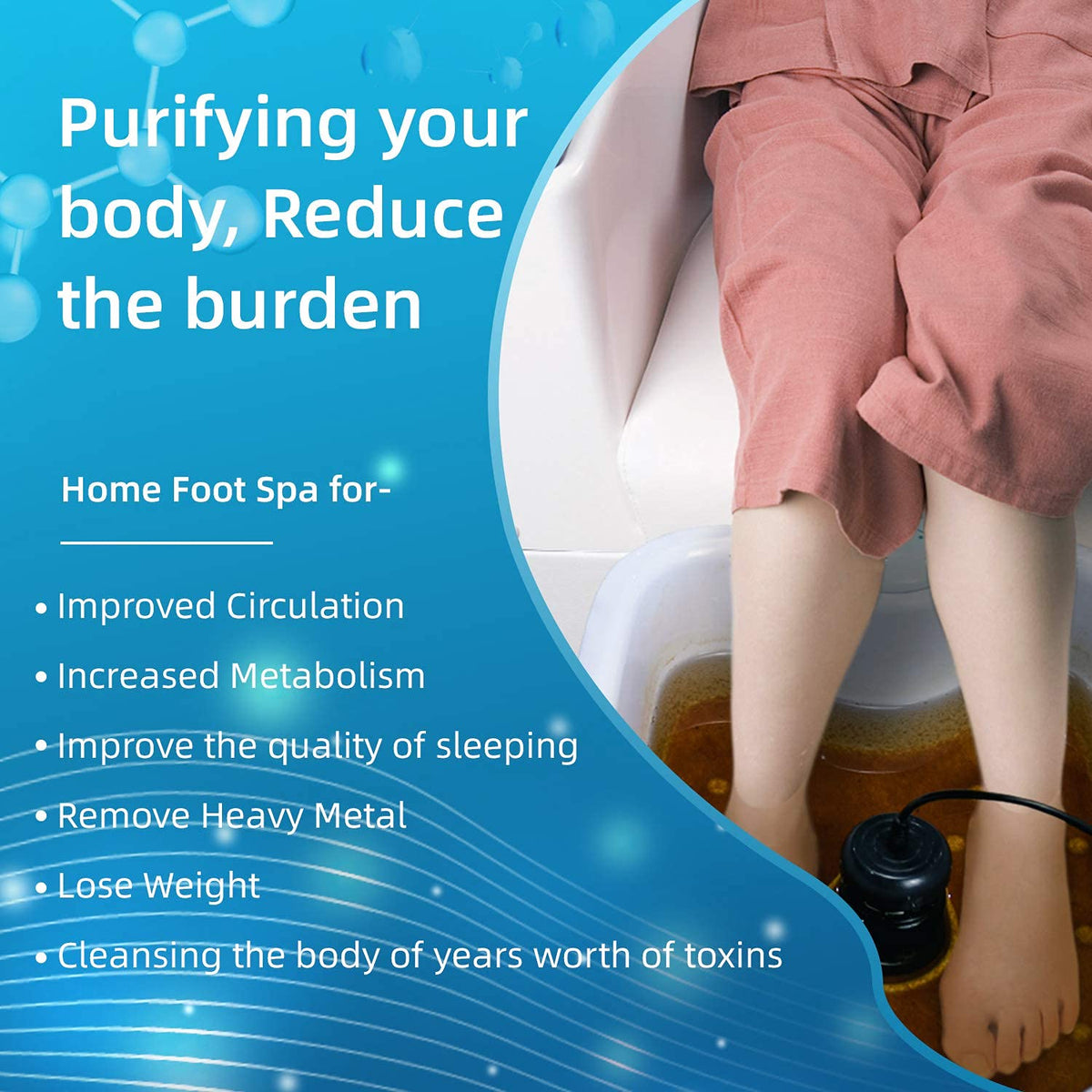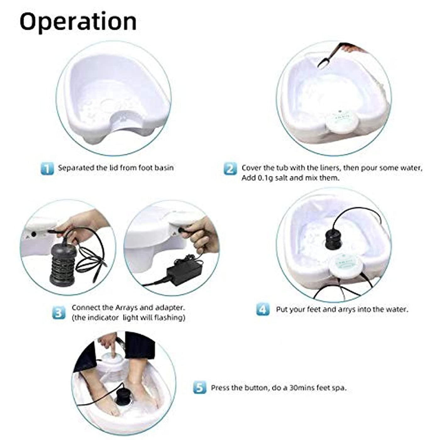 Q: Is the foot spa machine easy to use?A: Yes, the foot spa machine is designed for easy use. Simply cover the basin with liners, add water, mix in a small amount of salt, insert the ion arrays, and place your feet in the water before starting the machine.