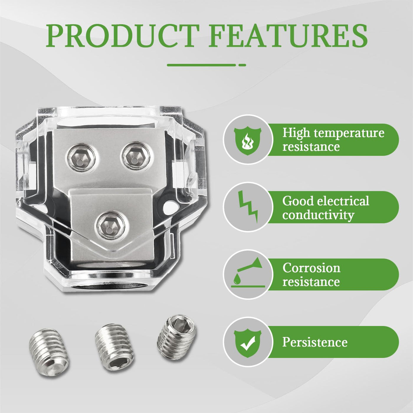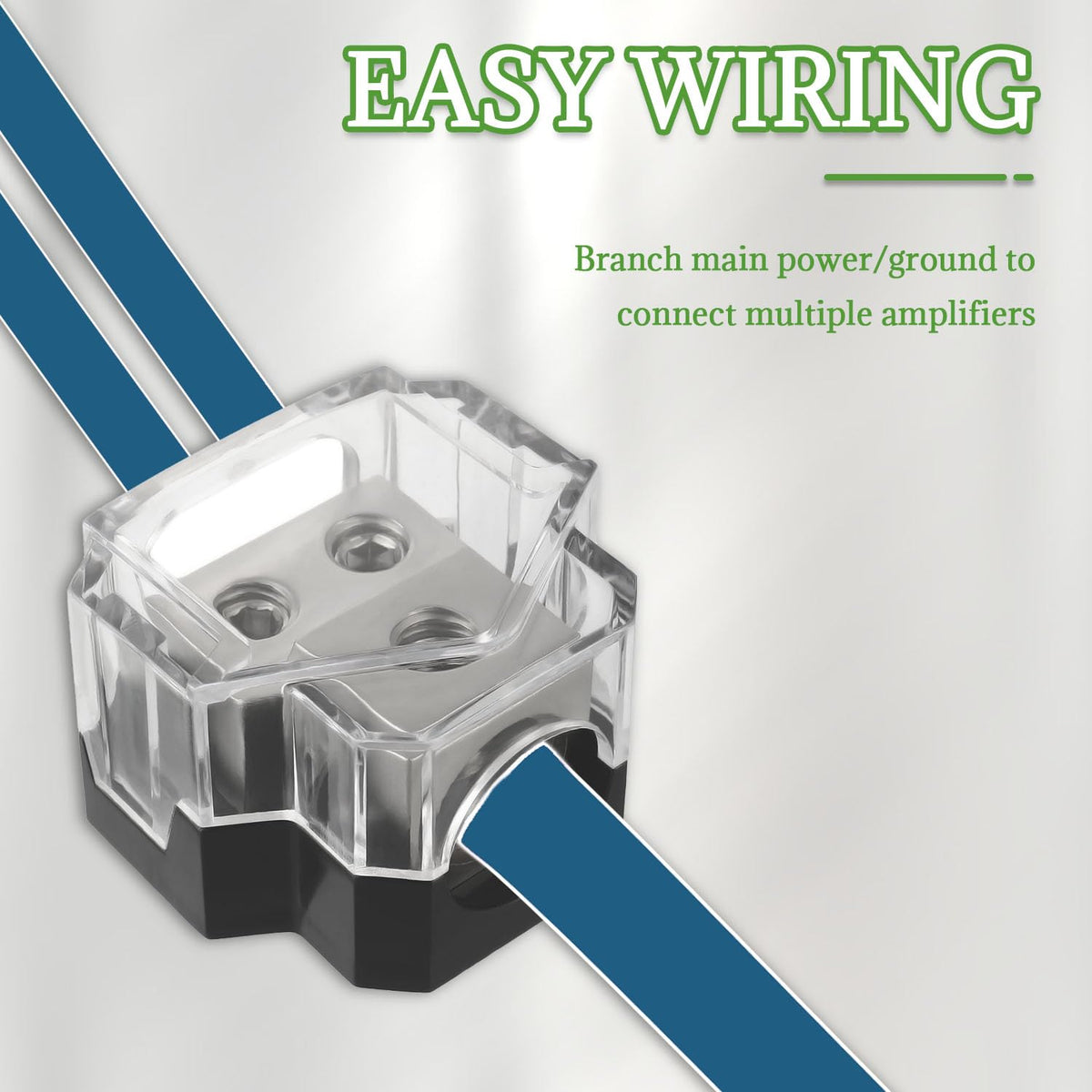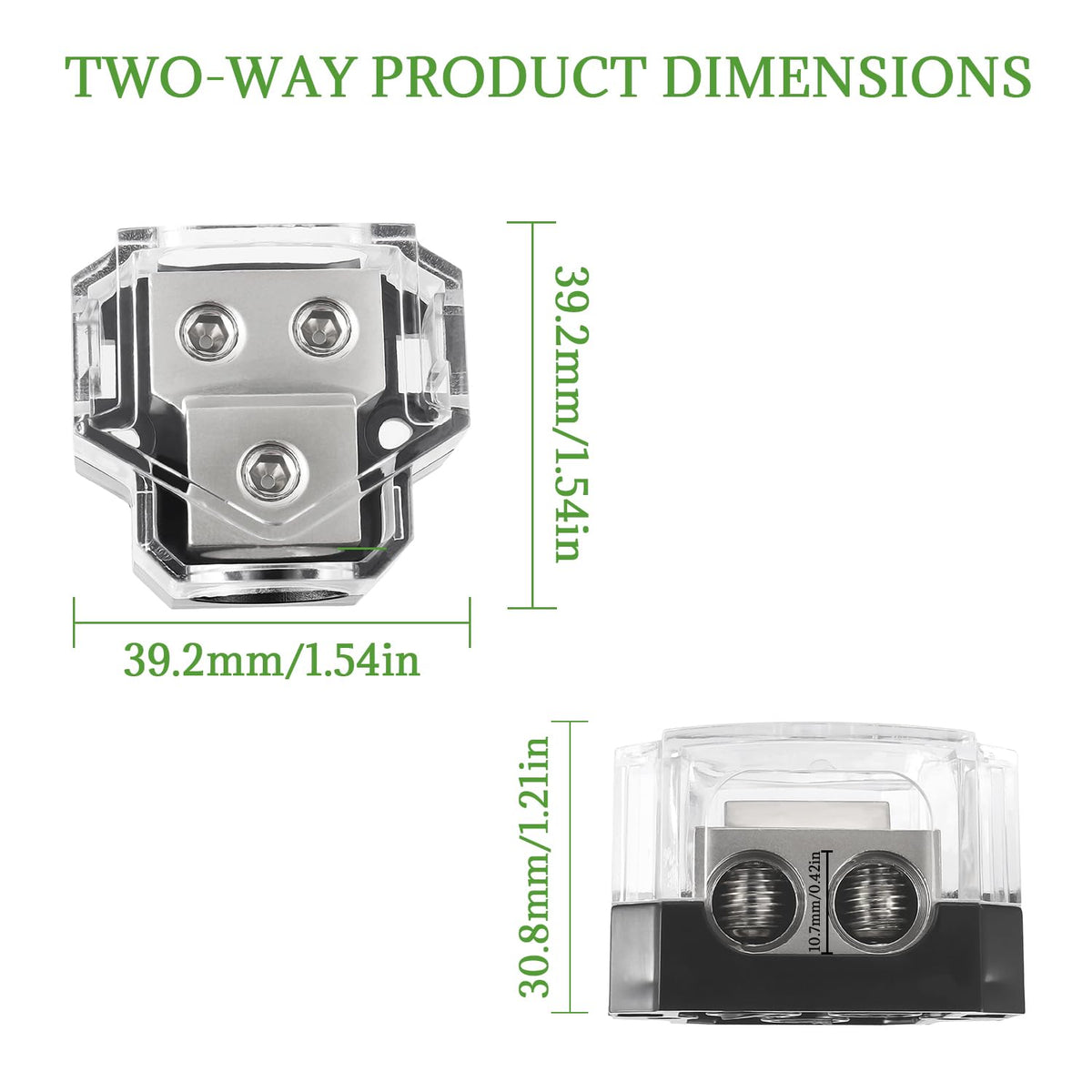 Bojack 2 Way Power Distribution Connecting Block Specifications Weight:71G / Pc Size: 34 X36 X 30Mm(1.3X1.4X1.1Inches) Input Accepts 1X0/2/4 Awg Gauge Output Accepts 2X4/8 Gauge Scope Of Application It Is Suitable For Cars, Boats, Rvs, Atvs Or Other Vehicles, Protecting The Sound System Of Your Vehicle. Important Note To Enhance Vehicle Protection, It Is Advisable To Incorporate An Inline Fuse Holder Between The Distribution Block And Your Vehicle'S Battery. Additionally, This Distribution Block Can Also Be Used To Consolidate The Ground Wires Of Multiple Amplifiers Into A Single Grounding Point. Assemblies 1 2 Way Power Distribution Block