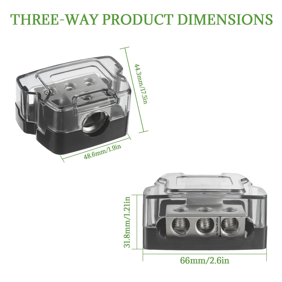 Bojack 3 Way Power Distribution Connecting Block Specifications Weight:112G / Pc Size: 63 X 40 X 30Mm(2.4X1.5X1.1Inches) Input Accepts 1X0/2/4 Awg Gauge Output Accepts 3X4/8 Gauge Scope Of Application It Is Suitable For Cars, Boats, Rvs, Atvs Or Other Vehicles, Protecting The Sound System Of Your Vehicle. Important Note To Enhance Vehicle Protection, It Is Advisable To Incorporate An Inline Fuse Holder Between The Distribution Block And Your Vehicle'S Battery. Additionally, This Distribution Block Can Also Be Used To Consolidate The Ground Wires Of Multiple Amplifiers Into A Single Grounding Point. Assemblies 1 3 Way Power Distribution Block