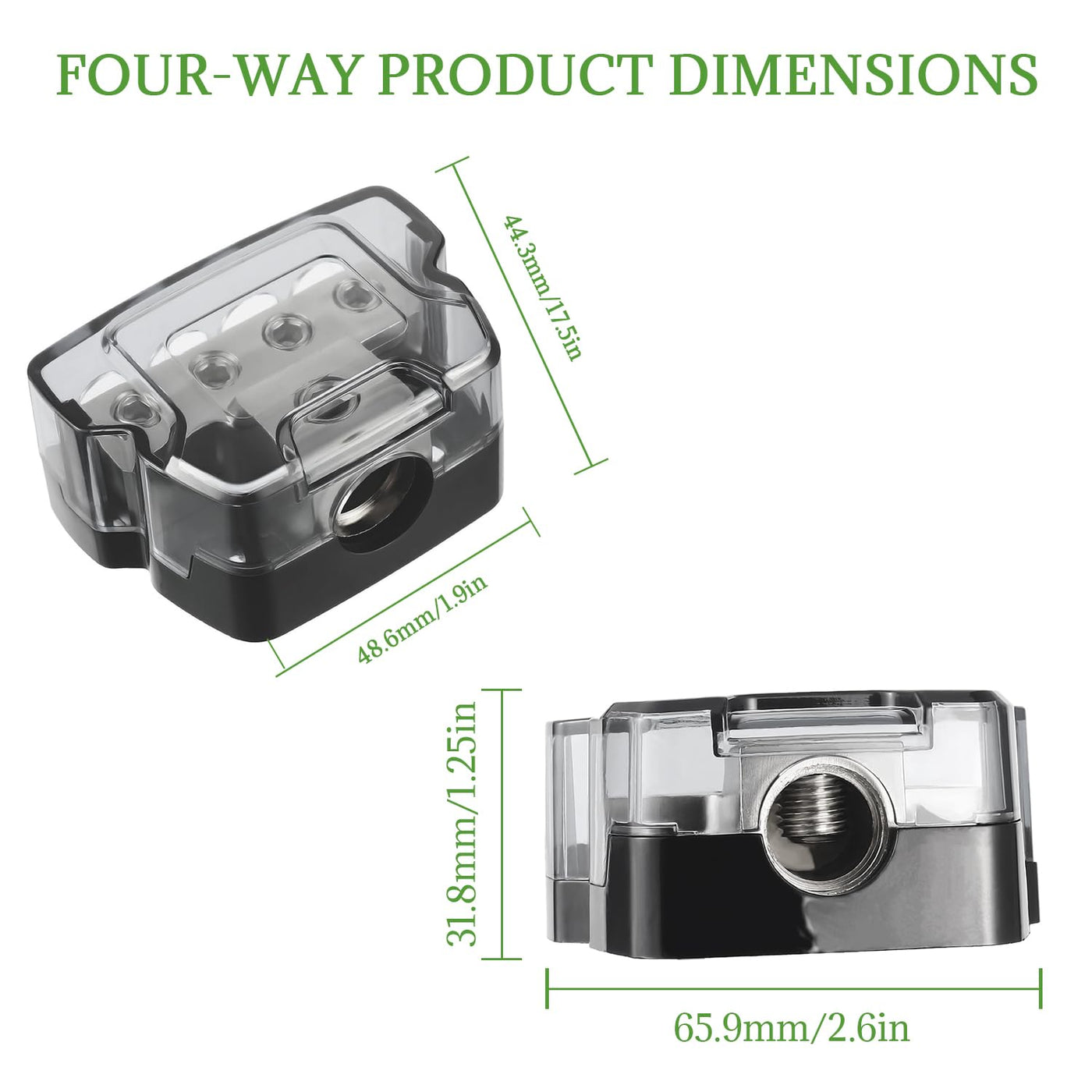 Bojack 4 Way Power Distribution Connecting Block Specifications Weight: 123G / Pc Size: 65 X 45 X 30Mm(2.5X1.7X1.1Inches) Input Accepts 1X0/2/4 Gauge Output Accepts 4X 4/8 Gauge Scope Of Application It Is Suitable For Cars, Boats, Rvs, Atvs Or Other Vehicles, Protecting The Sound System Of Your Vehicle. Important Note To Enhance Vehicle Protection, It Is Advisable To Incorporate An Inline Fuse Holder Between The Distribution Block And Your Vehicle'S Battery. Additionally, This Distribution Block Can Also Be Used To Consolidate The Ground Wires Of Multiple Amplifiers Into A Single Grounding Point. Assemblies 1 4 Way Power Distribution Block