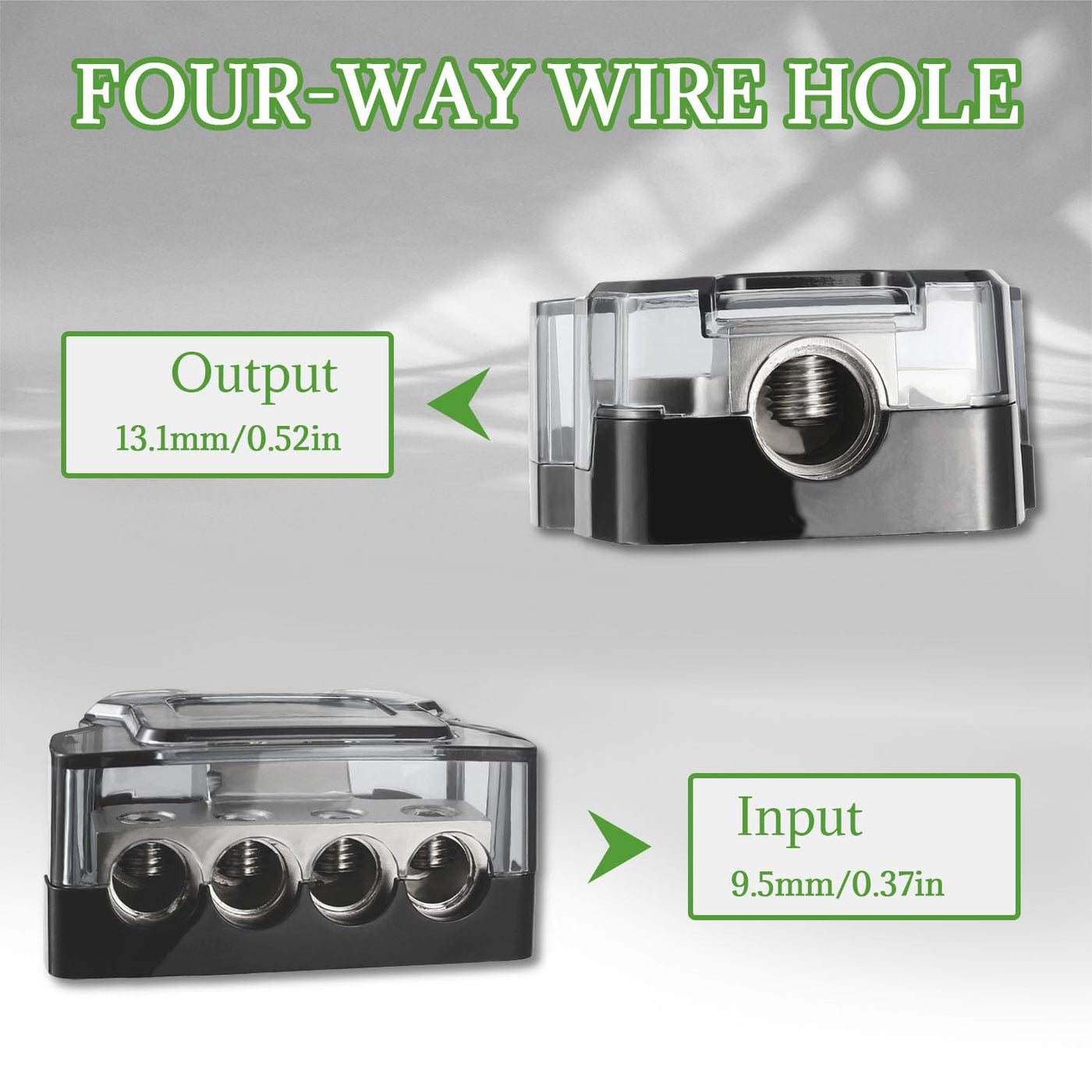 Q: What gauge wires can be used with the BOJACK 4 Way Power Distribution Block?A: The BOJACK 4 Way Power Distribution Block accepts input wires of 1x0/2/4 AWG gauge and can output wires of 4x4/8 gauge, making it versatile for various audio system setups.