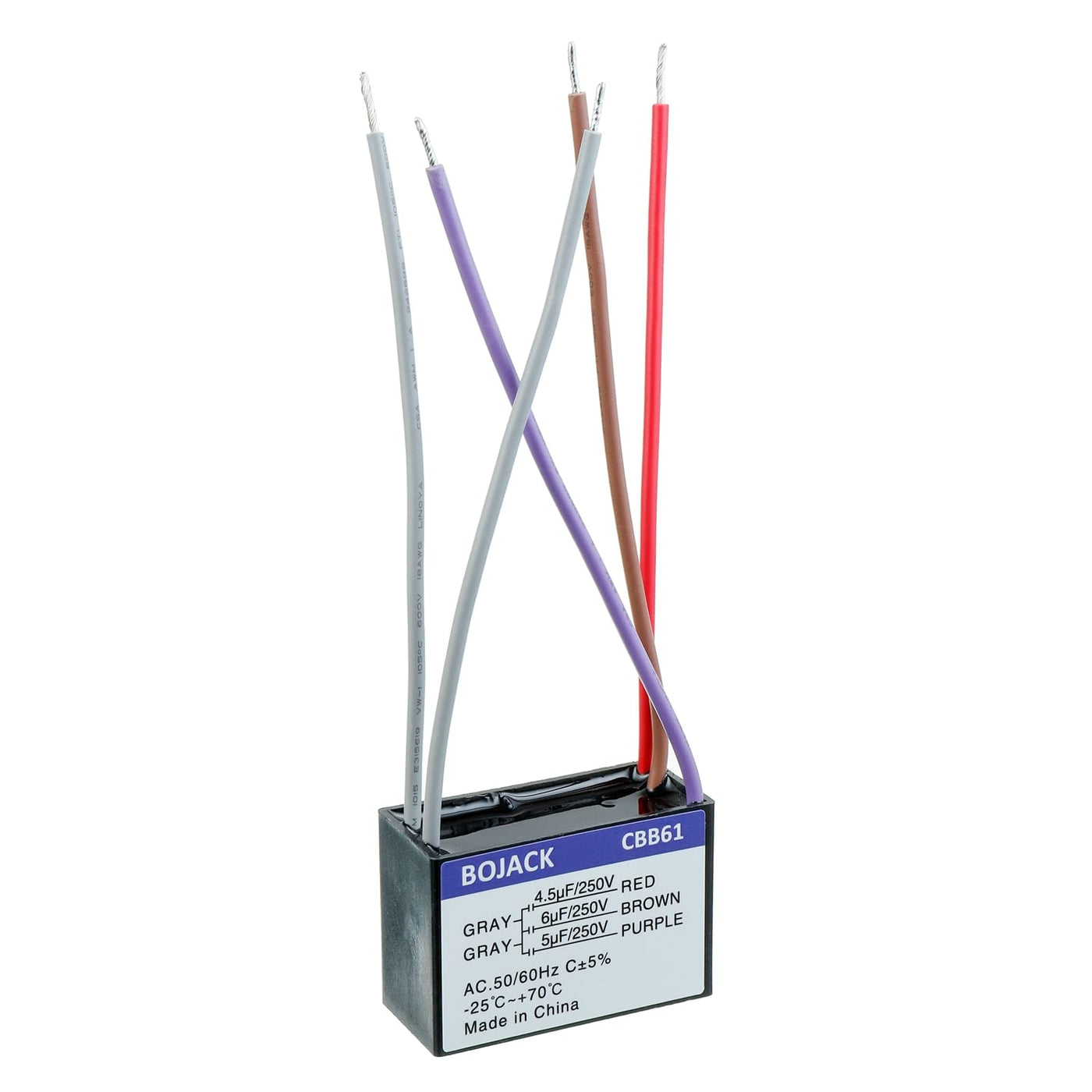 Bojack High Quality Cbb61 Ceiling Fan Starting Capacitors Electrical Parameters: Model : Cbb61 Capacity: 4.5Uf+6Uf+5Uf Tolerance: 5% Rated Voltage: 250V Ac Rated Frequency : 50/60Hz Operating Temperature: -25 ? To +70? Capacitor Lead-Out: Ul#1015/18Awg -10Cm Lead Capacitor Size:50X23X34 Mm/1.97X0.90X1.33 Inch(L*W*H)