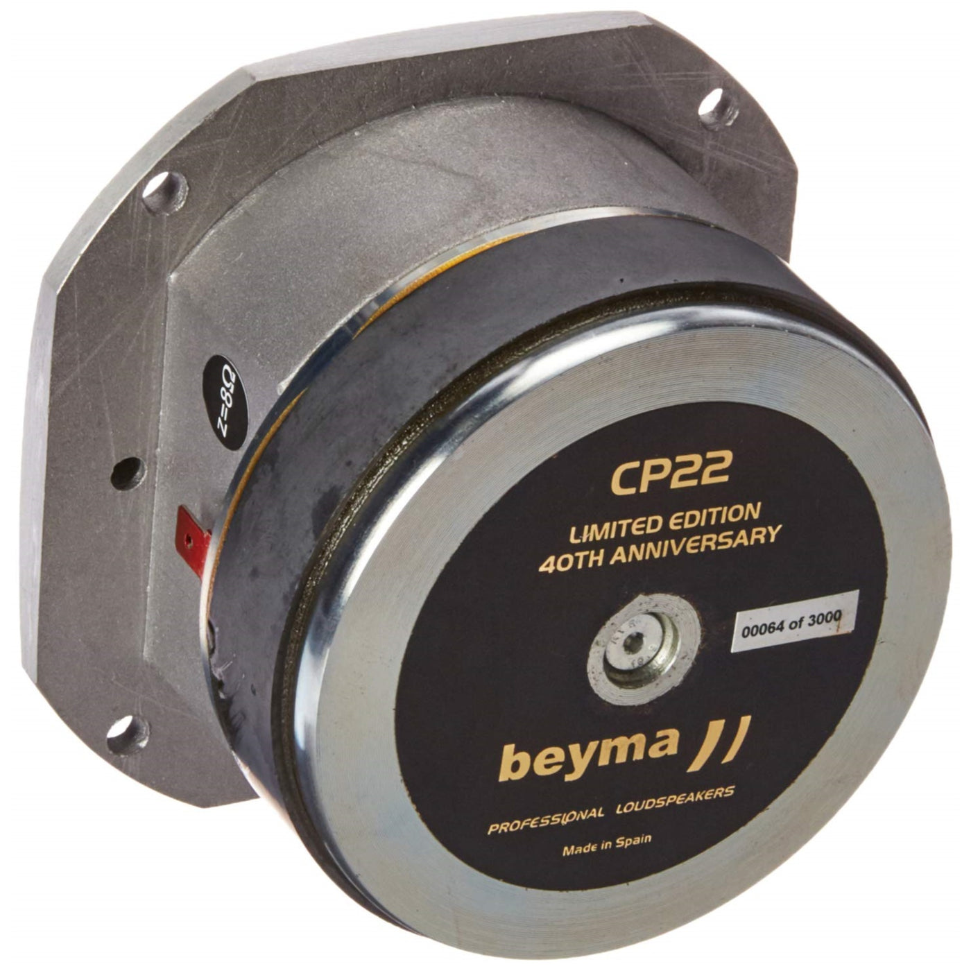 This compression tweeter is designed for use in multi-element loudspeaker systems in sound reinforcement applications that require high output, narrow controlled dispersion and long throw. This model produces a very high output level with flat response and excellent transient attack. This unit features an aluminium voice coil diaphragm assembly, which is field replaceable without soldering... Nominal impedance: 8 Ohm. Minimum impedance: 7.9 ohm. Sensitivity: 107 dB 1 W @ 1 m. Re: 6.3 ohm. Frequency range: 5000-20000 Hz. Power capacity: 25 W AES. Program power: 50 W. Recom. crossover frequency: 5 kHz or higher (12 dB/oct. min slope). Dispersion HxV: 40 Degrees conical. Voice coil diameter: 38.1 mm 1.5 in. Flux density: 1.55 T. BL factor: 5.2 N/A. Diaphragm material: Aluminium