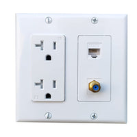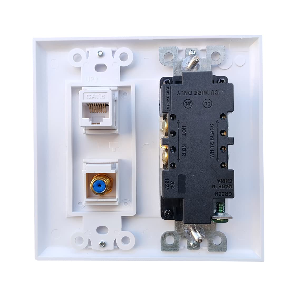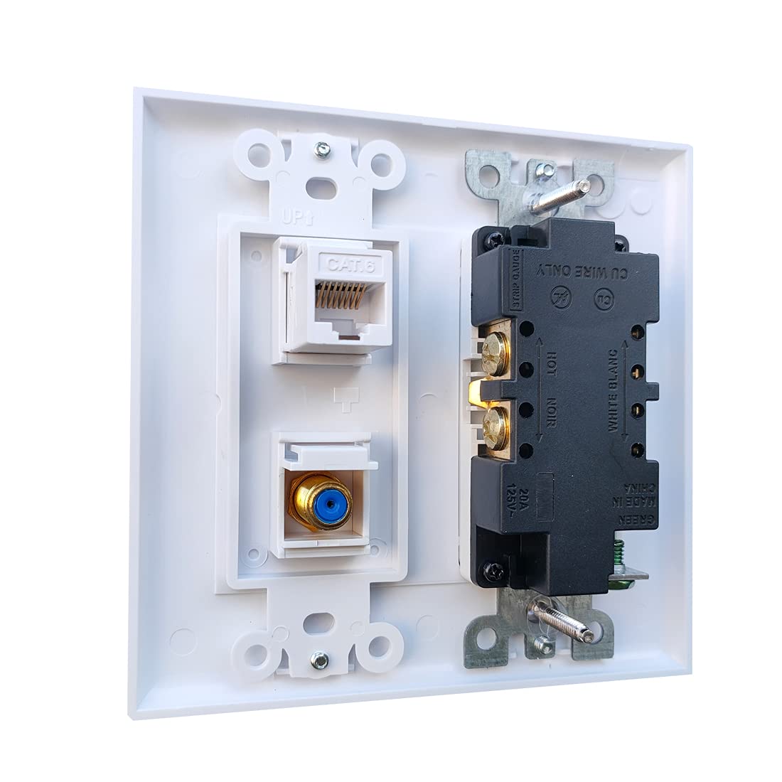 Boplat 2 Gang Ethernet Coax Wall Plate With 20Amp Power Outlet Duplex Receptacle Outlet Cover Plate With Coaxial Ethernet +1 P