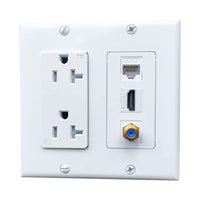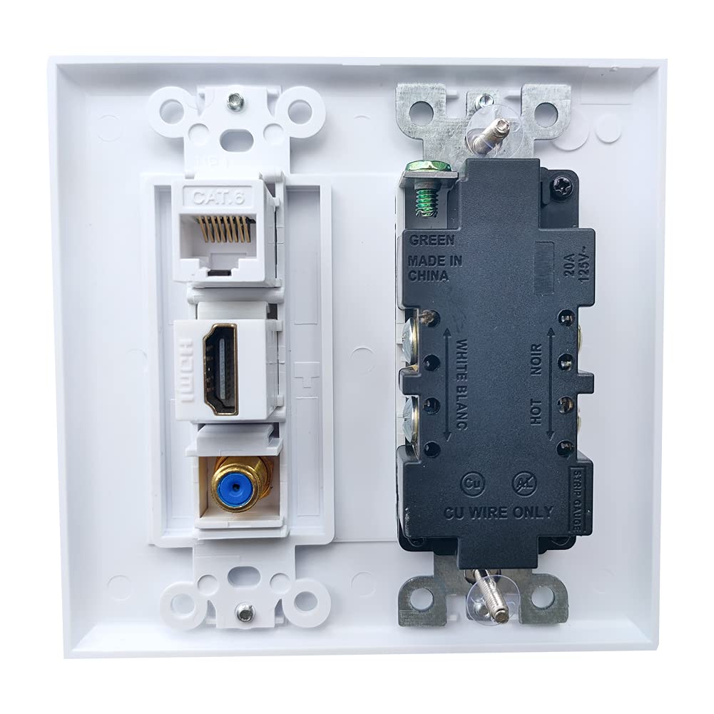 Double Gang Hdmi Ethernet Coax Wall Plate With 20Amp Power Outlet - 1 Port Hdmi Keystone Jack+ 1 Port Cat6 Rj45 Ethernet + 1 Coax Cable Face Plate - White