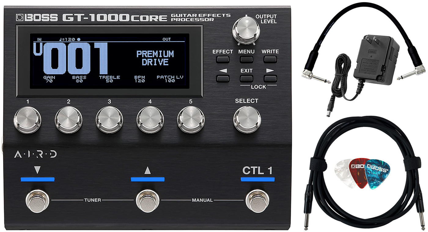 Boss Gt 1000Core Guitar Effects Processor Bundle With Power Supply, Instrument Cable, Patch Cable, And Picks