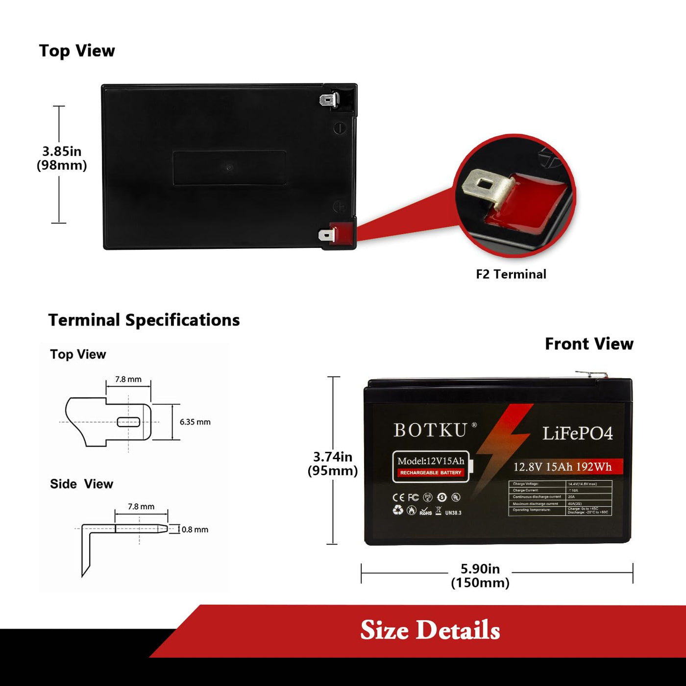 Q: What is the size of the BOTKU 12V 15Ah battery?A: The BOTKU 12V 15Ah battery measures five point ninety-one inches in length, three point eighty-six inches in width, and three point seventy-four inches in height.
