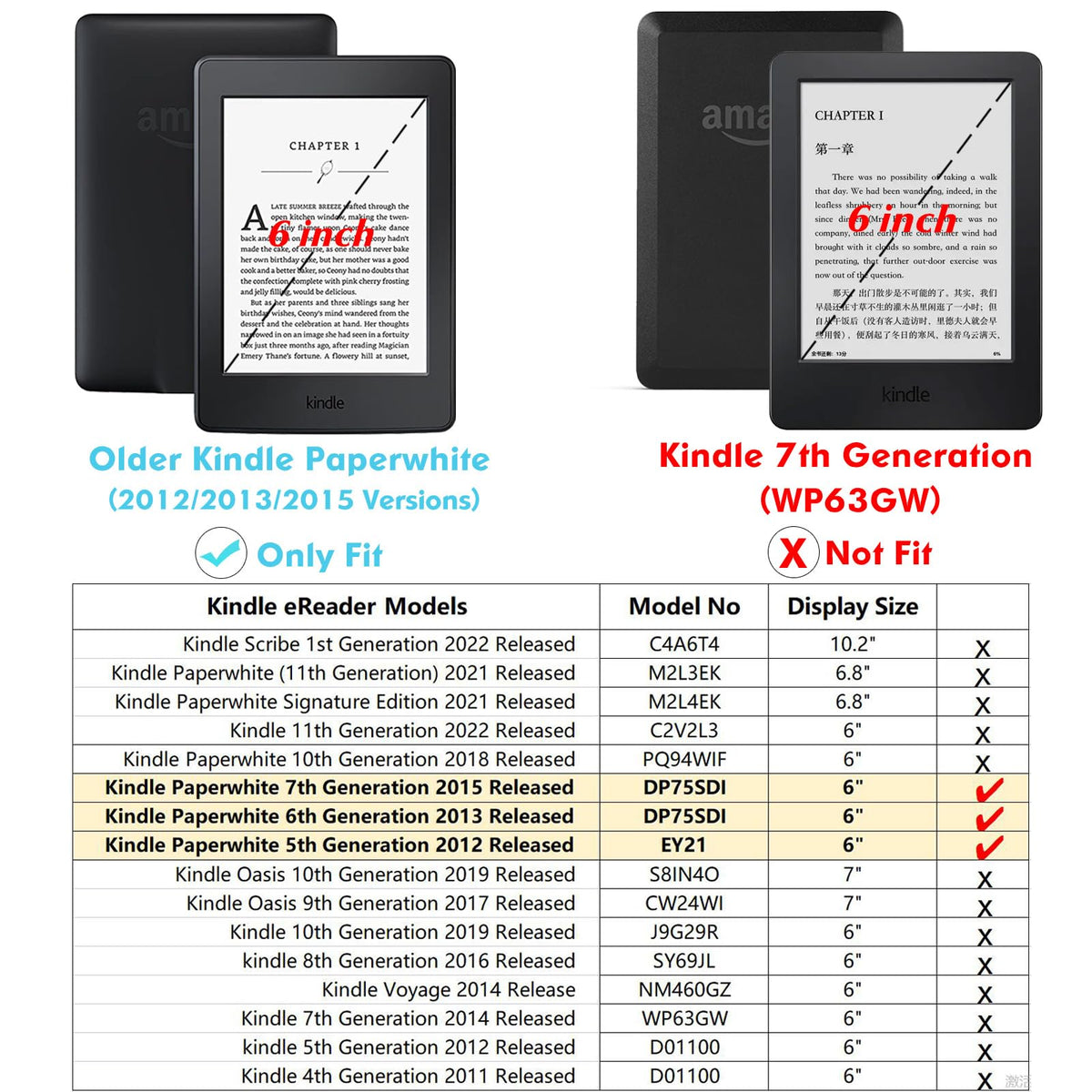 [Item Information]:Bozhuorui Slim Case For Kindle Paperwhite 5Th/6Th/7Th Generation Prior To 2018. [Brand]:Bozhuorui [Compatibility]:Only Compatible With Kindle Paperwhite 5Th/6Th/7Th Generation (2012 - 2017 Release,Model Ey21 And Dp75Sdi). [Product Weight]:91 Gram. [Will Not Fit]:Not Fit Kindle 7Th Generation 2014 Release (Wp63Gw)/Not Fit Kindle Touch/Not Fit Kindle Oasis/Not Fit Kindle 10Th Generation/Not Fit Kindle Paperwhite 10Th Generation And Not Fit 6.8 Inch Kindle Paperwhite 11Th Generation.(Please Confirm Your Device Model Before Purchasing). [Material]:The Surface Layer High Quality Pu Synthetic Leather,Soft Fiber Lining,Pc Hard Shell At The Bottom [Product Style]:Book Folio Style/Slim/Lightweight [Product Feature]:With Auto Sleep/Wake. [Magnetic Closure]:Integrated Magnets Keep The Cover Securely Closed [Packaging Information]:Kindle Paperwhite 5Th/6Th/7Th Generation Cover Case * 1