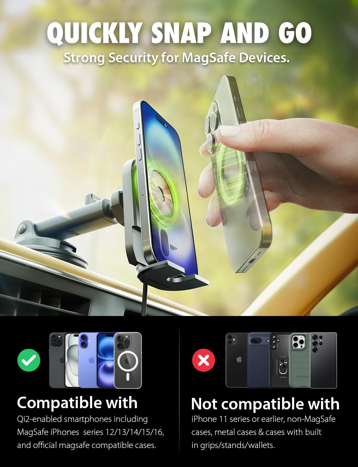 Upgrade Your Daily Commute With The 3-In-1 Magsafe Wireless Car Charger & Mount - The Ultimate All-In-One Solution For Charging And Securing Your Phone While Driving. Bracketron 2025 Pwrup Magalign Series Extend Magsafe Car Phone Holder Charger Is Engineered For Versatility, It Combines A Powerful Magnetic Mount, Fast Wireless Charging, And Three Installation Options Windshield+Dashboard+Vent To Fit Any Car Setup. Triple Installation Flexibility: Dashboard/Windshield: Use The Heavy-Duty Suction Cup With 3M Adhesive Pad For A Rock-Solid Grip On Smooth Surfaces. Adjust The Telescopic Arm To Position Your Phone Within Easy Reach, Whether For Gps Navigation Or Hands-Free Calls. Air Vent: The Reinforced Metal Clip Clamps Securely To Horizontal/Vertical Vents, The Car Phone Holder Charger Is Ideal For A Clutter-Free Dashboard And Quick Access To Your Device. Effortless Charging & Mounting: Magsafe Users Enjoy Instant Alignment And 15W Fast Charging For Iphone 15/14/13/12 Series, While Non-Magsafe Phones Can Use The Included Metal Ring For Magnetic Compatibility. The 360 Swivel Ball Joint Of Magsafe Car Charger Lets You Switch Between Portrait And Landscape Modes Effortlessly, Ensuring The Perfect Viewing Angle Without Blocking Air Vents Or Obstructing Your View. Safety & Reliability: Built With Advanced Safety Technology, This Car Wireless Charger Protects Against Overheating, Overcharging, And Voltage Fluctuations, Keeping Your Device Safe During Every Drive. The Case-Friendly Design Works With Most Protective Covers (Up To 5Mm), And The Durable Construction Withstands Extreme Temperatures And Daily Vibrations. Whats In The Box? 1X Magsafe Wireless Car Charger 1X Windshield Suction Cup Mount 1X Dashboard 3M Adhesive Pad 1X Air Vent Clip 1X Metal Ring For Non-Magsafe Phones 1X Usb-C To Usb-C Cable (2.0A+). User Manual Compatibility: Magsafe Iphones: 15/15 Pro/15 Pro Max, 14/14 Pro/14 Pro Max, 13/13 Pro/13 Pro Max, 12/12 Pro/12 Pro Max Non-Magsafe Phones: Use The Included Metal Ring For Magnetic Attachment (Works With All Smartphones). Input: 9V/2A (Qc 3.0 Adapter Recommended, Not Included) Streamline Your Driving Experience - Charge, Mount, And Navigate With Confidence. Order Magsafe Car Mount Charger Now And Enjoy A Safer, Smarter Commute!