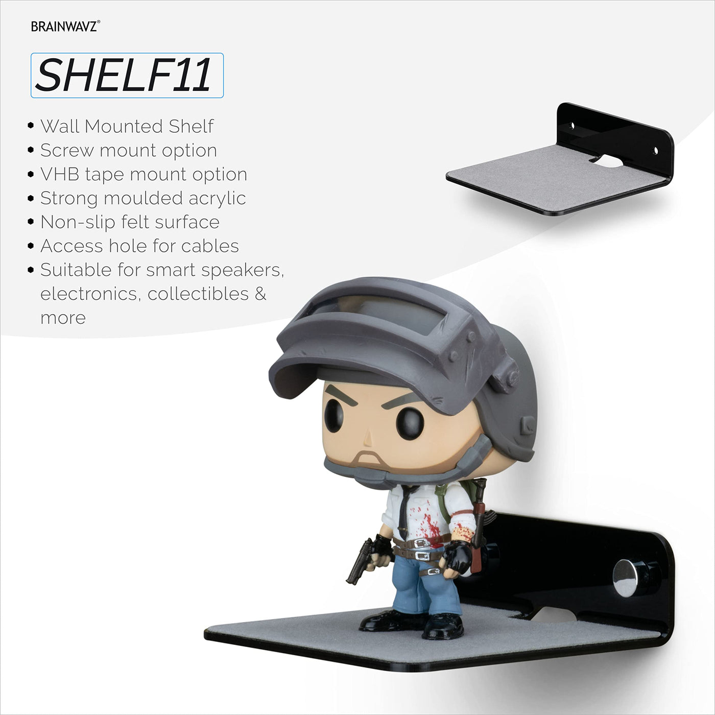 Brainwavz Square Universal Wall Mount Floating Shelves For Use All Around The Home And Can Be Installed Easily And Quickly To Store And Show Off Small Items And Accessories. Use Some Of That Empty Wall Space To Place Your Bluetooth Speakers, Webcam, Smart Devices, Routers Or Show Off Your Action Figure Collection, Display Your Favourite Figurine Or Collectibles, Or Maybe You Have Some Small House Plants That Need A Home. Find An Empty Space And Get Creative, You Will Have A Feature Wall Showing All Your Favourite Stuff In No Time. The Shelf11 Comes With Pre Pre-Installed Anti Slip Felt Base Which Will Stop Your Devices And Objects From Easily Sliding Off The Slick Acrylic Surface. Our Acrylic Floating Shelves Can Either Be Securely Screwed To The Wall, Or You Can Use The Included Self-Adhesive Vhb Tape For An Easy Screw-Free Mounting Option.
