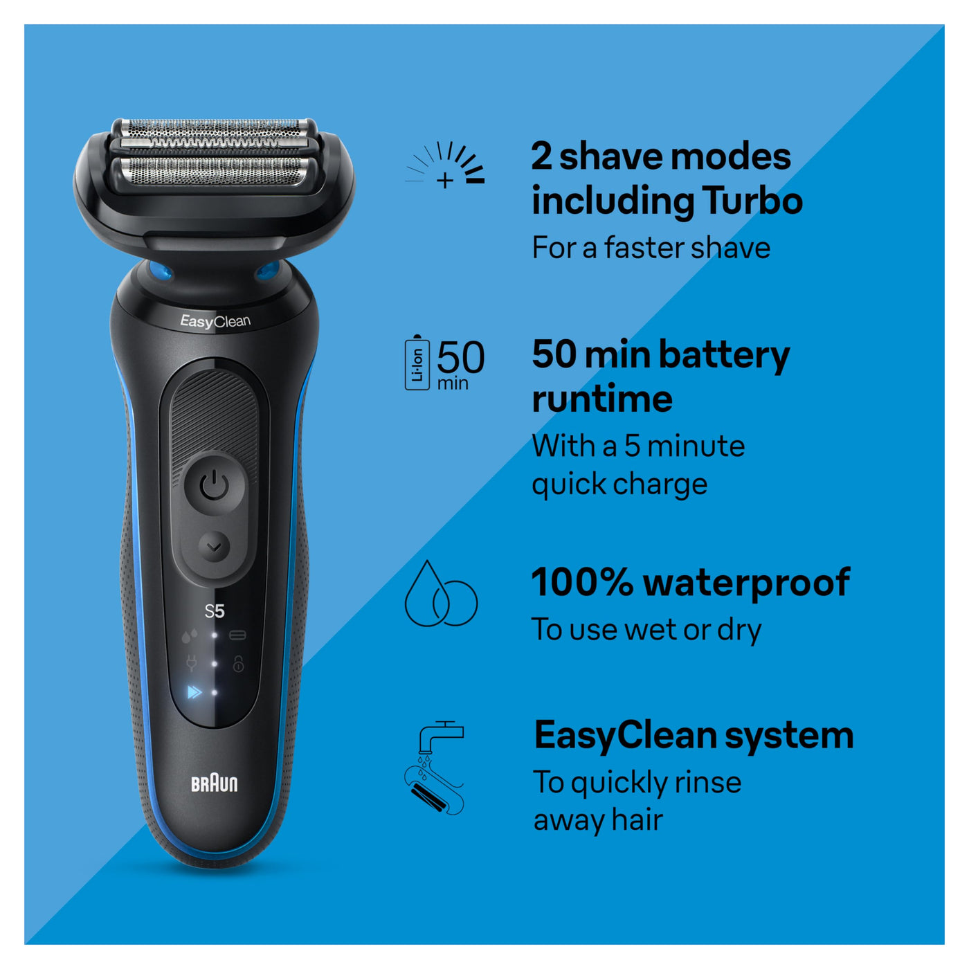 Braun Series 5 5120S Electric Shaver For Men Gives You A Clean Shave, Faster.* Made To Adapt To Your Shaving Needs, This Mens Shaver Features 3 Flex Blades That Adapt To Your Unique Contours. This Mens Electric Shaver Comes With 2 Shave Modes: A Standard Mode For Optimal Balance Between Power And Comfort, And A Turbo Mode For An Extra Fast Shave. Easily Swap And Upgrade Your Shaver Heads Thanks To The Easyclick System. This Waterproof Mens Shaver Is Engineered In Germany For Guaranteed Quality. Up To 50 Min Li-Ion Battery Time. Box Includes: 1X Series 5 Shaver, Cleaning Brush, Beard Trimmer Attachments. *Vs Previous Braun Series 5
