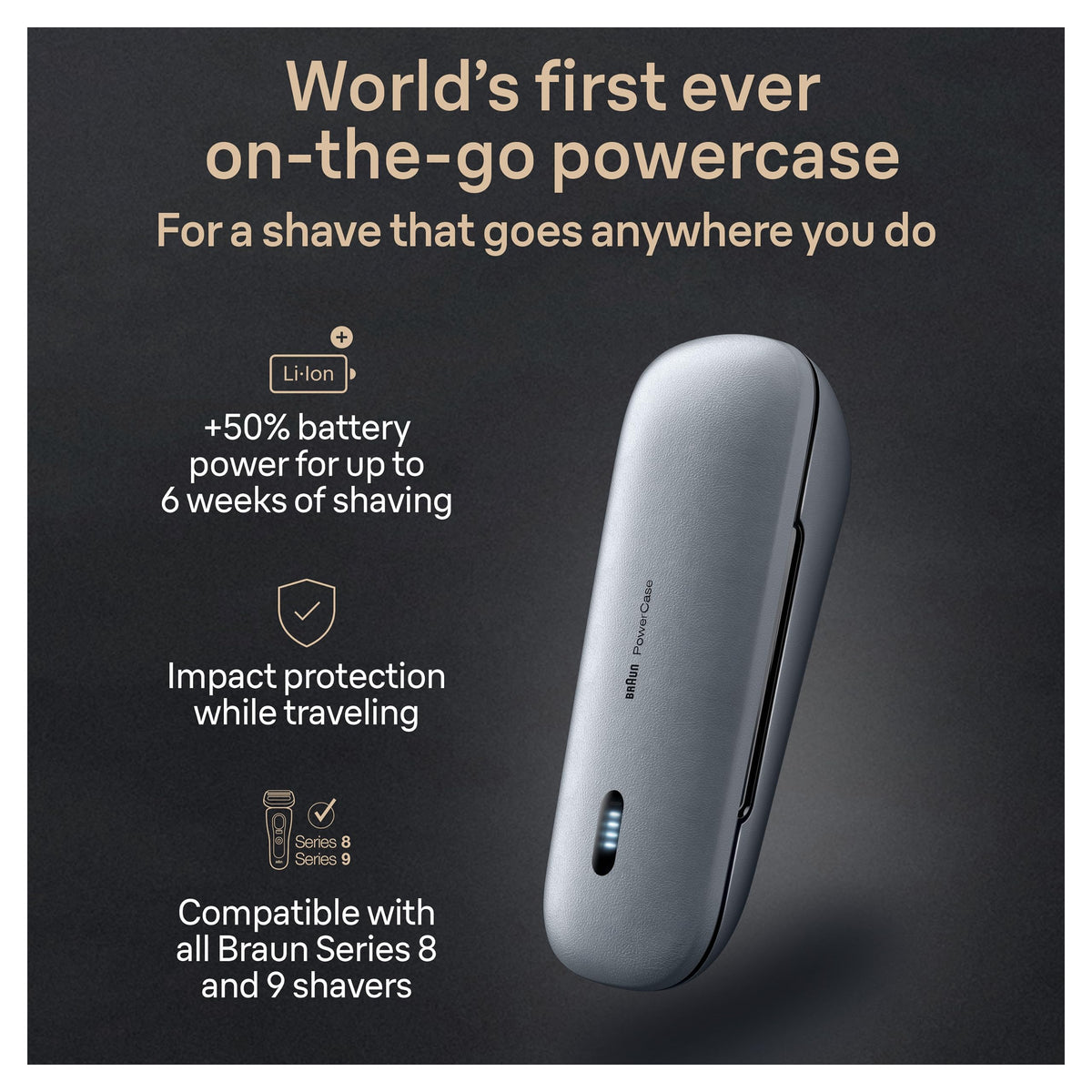 Meet Braun Powercase: The World'S First Fully Portable Shaver Charger Case. The Case Provides 50% More Battery Runtime-That'S Up To 6 Weeks Of Cordless Shaving Anytime, Anywhere. The Powercase Is Built From Durable Premium Materials, And Is Designed To Protect Your Shaver From Bumps, Scratches, Dust, And Spillage. Fully Compatible With Braun Series 9 Pro, Series 9 And Series 8 Electric Shavers For Men. Get The World'S First Ever On-The-Go Powercase For A Shave That Goes Anywhere You Do. Designed For Impact Protection While Traveling.