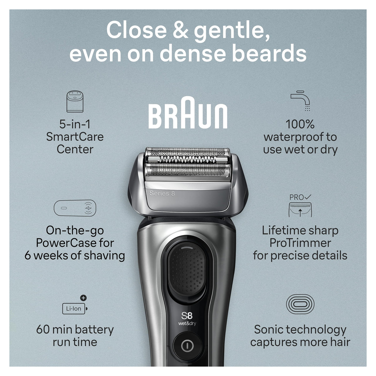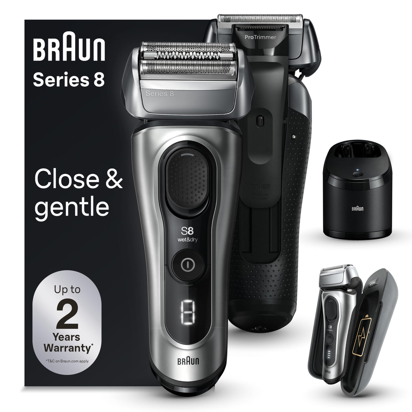 Level Up Your Beard Care Routine And Shave Experience With Brauns Upgraded Series 8 Electric Shaver For Men. This Braun Wet And Dry Shaver Delivers A Close And Gentle Shave Even Under The Chin And Nose. Featuring A 40-Degree Swiveling Head And Floating Blades, This Foil Shaver Gently Adapts To Facial Contours, Ensuring Closeness And Skin Comfort. Braun'S Unique Sonic Technology Uses 10,000 Micro-Vibrations To Help Capture More Hair While Gently Gliding Over The Skin. In Addition, Autosense Technology Reads And Adapts To Your Beard To Provide Extra Power Where You Need It Most, For A Close Shave Even On Dense Beards. The Protrimmer, An Integrated Precision Beard Trimmer, Slides Out Of The Back Of The Braun Shaver To Easily Cut Tricky Hair-Even Fine Hairs And Sideburns. Braun Series 8 8577Cc Rechargeable Shavers For Men Use A Powerful Li-Ion Battery That Lasts For 60 Minutes Of Use And Includes A 5-Minute Quick Charge Option. These Electric Shavers For Men Are 100% Waterproof And Can Be Used With Foam, Gel Or Even Under The Shower. All Series 8 Men'S Electric Shavers Are Made In Germany With Premium Craftsmanship.