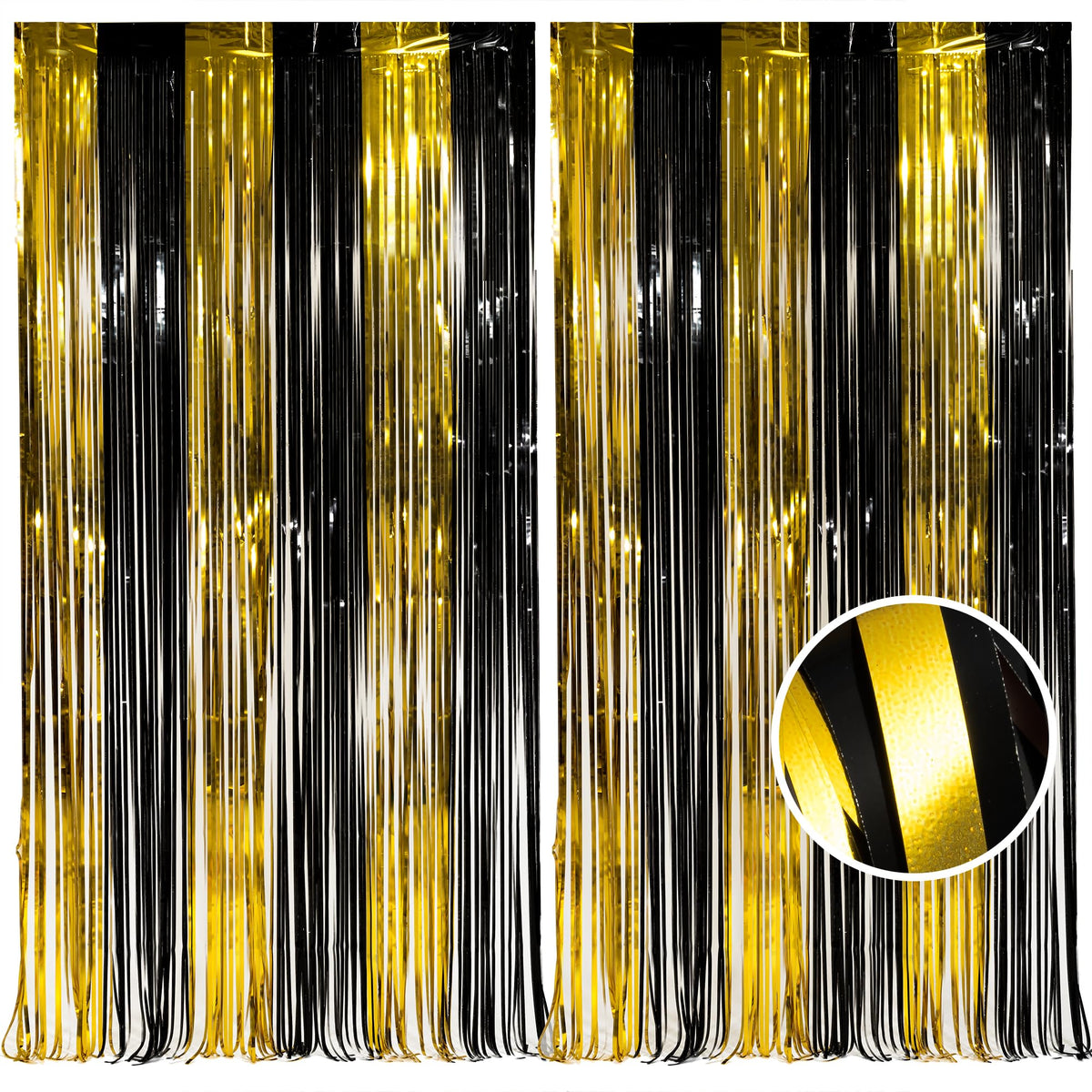 Braveshine 3.2 X 8.2 Ft Black Gold Foil Fringe Curtains 2 Pack Metallic Photo Booth Streamers Backdrop For Birthdays New Years