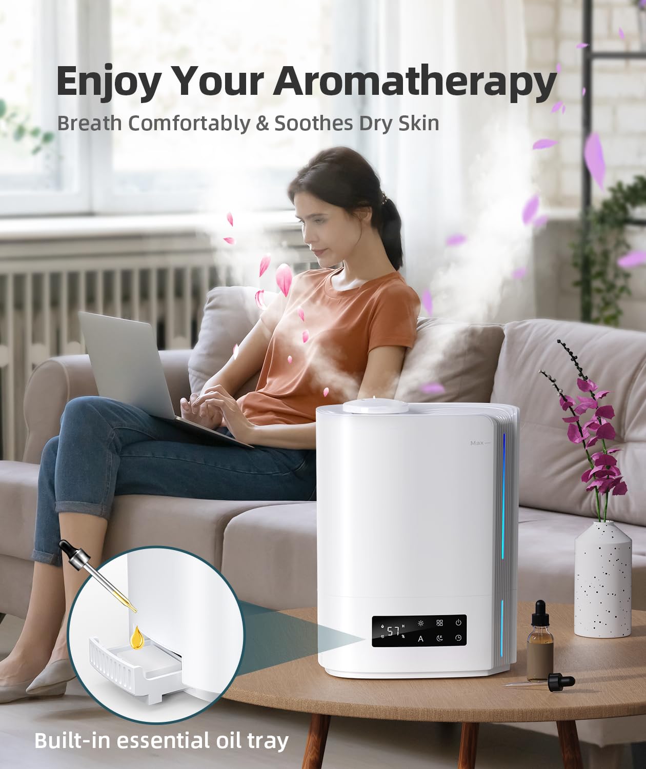 Powerful Humidification, Perfect For Bedroom & Baby Room: Our Ultrasonic Humidifier Has A 6L (1.6 Gallon) Large Tank That Works Great In Large Rooms Up To 500 Sq Feet. It Allows A Long Lasting Humidification For Up To 60 Hours. | Diffuser & Humidifier 2 In 1: Add Your Favourite Essential Oils To The Built-In Aromatherapy Tray, The Cool Mist Humidifier Can Mix Your Favourite Aroma With The Moist Air And Fill Your Room With Relaxing Aroma. | Automatically Control The Humidity Level: Our Humidifiers For Bedroom Is Designed With A Intelligent Humidistat Which Helps To Maintain The Pre-Set Humidity Level And Allows You To Check The Real Time Humidity Level. Just Setup Your Preferred Humidity Level And Let Our Humidifier Do The Rest. | Convenient Top Fill Design: Easily Clean The Water Tank Under Running Water With A Detachable Tank. It