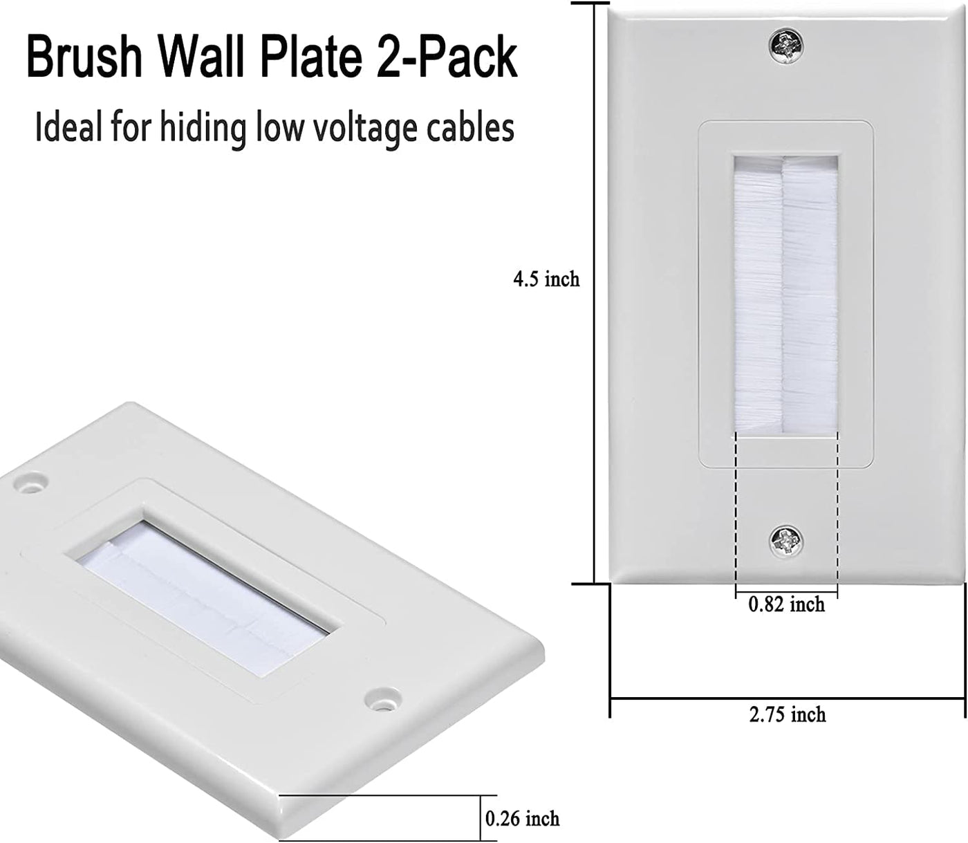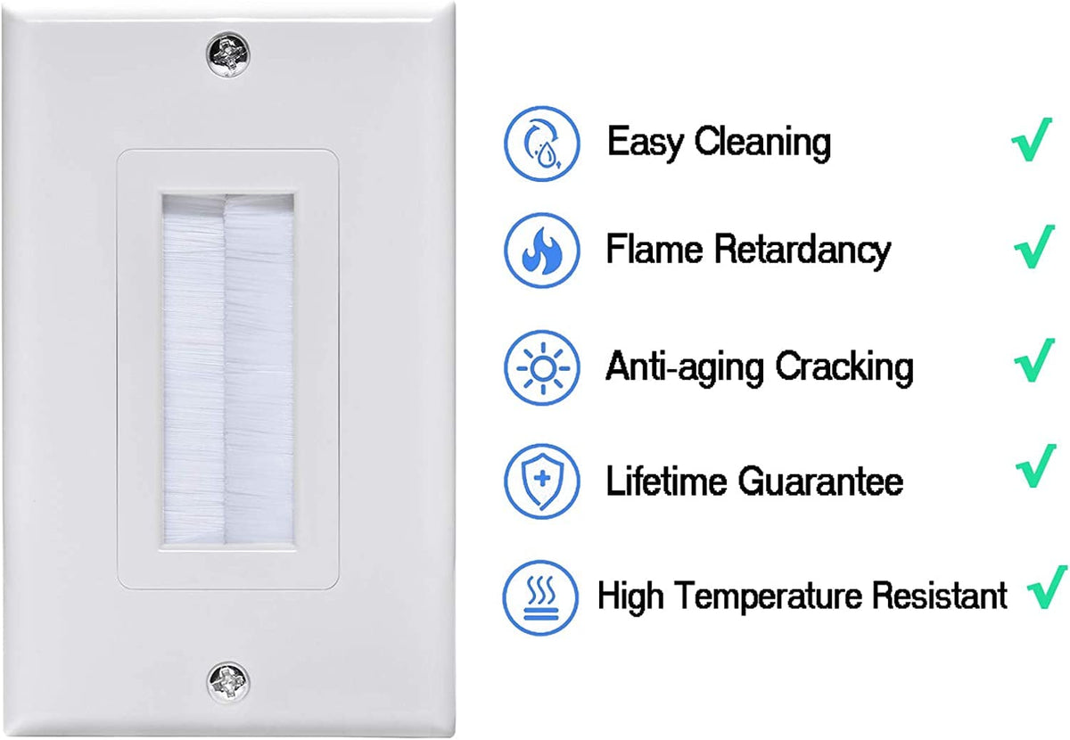 Q: What materials are used in the Brush Wall Plate?A: The brush wall plate is made from premium ABS flame-retardant plastic, ensuring durability and safety while the soft brush attached prevents any damage to the cables being passed through.