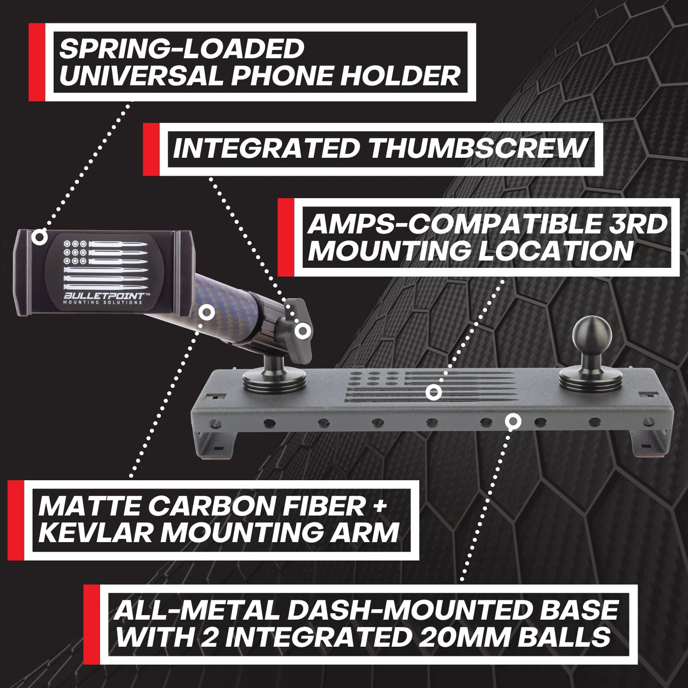 Upgrade Your F-Series. Go Bulletpoint! Looking For The Sturdiest Phone Mounting Solution Compatible With Your 2009-2014 Ford F-150? The Dual Ball F150 Phone Holder By Bulletpoint Mounting Solutions Is A Complete Kit Which Gives You The Ability Securely Mount Your Phone. The Extra Ball Mount Allows You To Mount An Additional Device (Components Sold Separately). Our Universal Spring-Loaded Phone Holder Opens Up To 3.4 Inches Wide And Is Compatible With Most Iphone And Android Phones. The Sleek Matte Carbon Fiber + Kevlar Mounting Arm Is Strong And Lightweight. It Features Integrated Thumbscrews Which Allow You To Easily Adjust The Position Of Your Phone. What'S Included In The Kit? 1X Metal Dash Mount With 2 20Mm Mounting Balls 1X Standard 7Cm Carbon Fiber + Kevlar Hybrid Mounting Arm 1X Spring-Loaded Universal Phone Holder (Expands Open Up To 3.4'' Wide) Quick & Solid Installation Installation Is As Simple As Removing The Top Dash Panel, Drilling 4 Holes, Securing The Base In Position With The Included Hardware And Pressing The Panel Back Into The Dash. The End Result Is A Rock Solid Mounting Base For Your Devices That You Can Depend On.Fitment 2009-2014 F-1502010-2014 F-150 Raptor