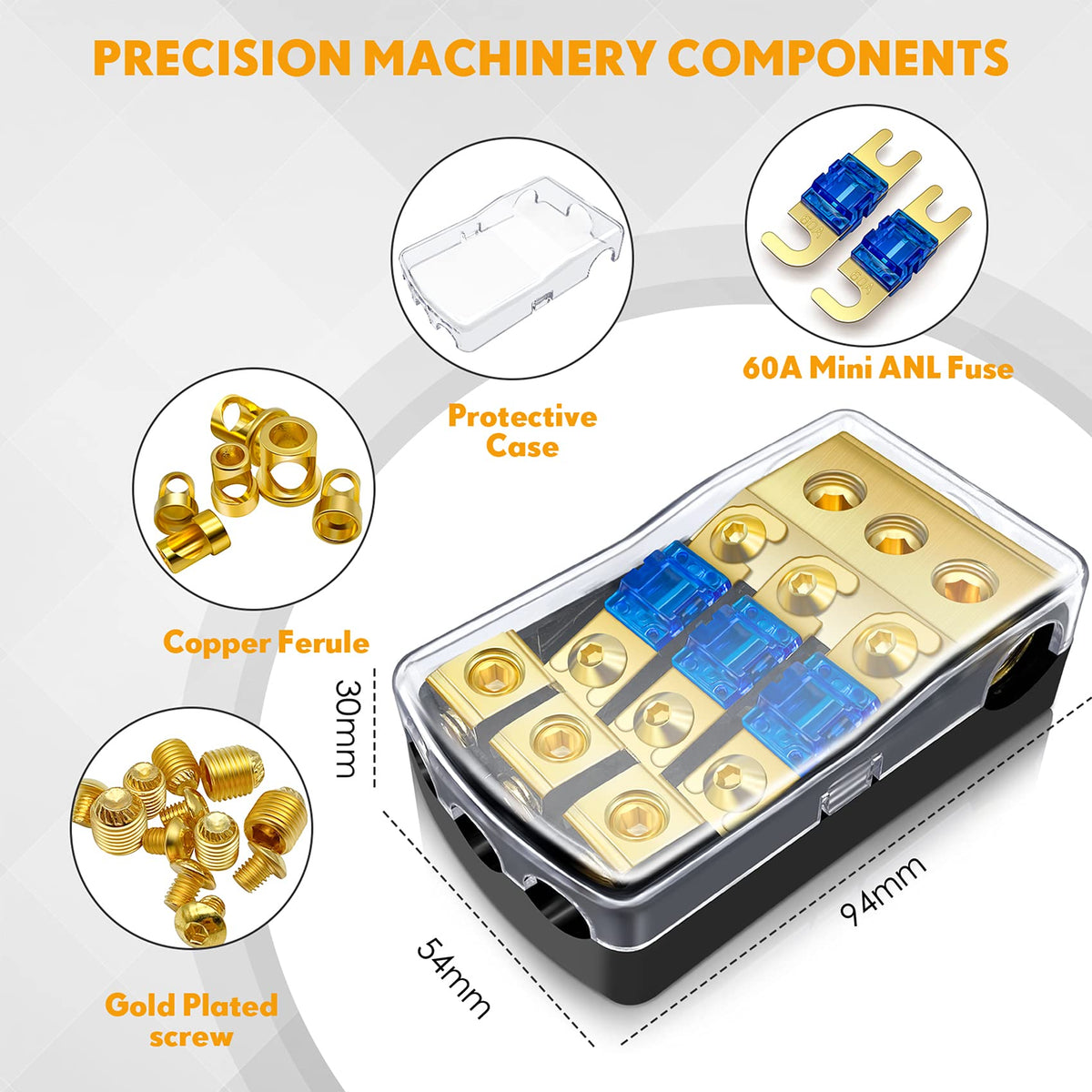 Bulvack 3 Way Mini Anl Fuse Holder, Copper 0/2/4 Gauge To 4/6/8 Gauge 60 Amp Fuse Distribution Block For Car Truck Boat Audio St