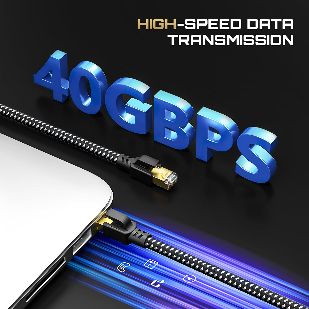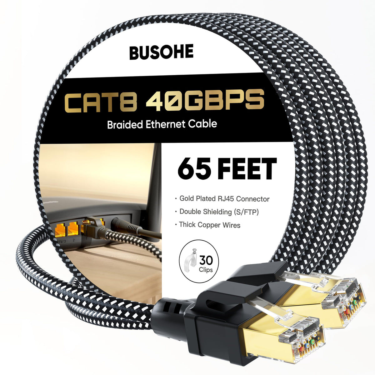 Busohe Cat 8 Ethernet Cable 65 Ft, High Speed 40Gbps 2000Mhz Braided Network Internet Cable With Gold Plated Rj45 Connector, Hea
