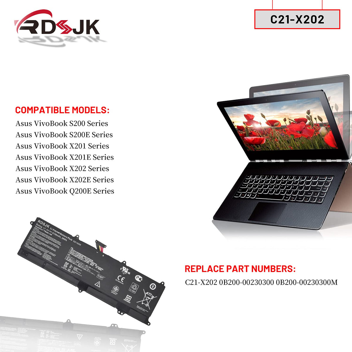 Q: What laptop models are compatible with the C21-X202 Laptop Battery?A: The C21-X202 Laptop Battery is compatible with various Asus VivoBook models including S200, S200E, X201, X201E, X202, Q200, and F201E series. Please refer to the product description for a complete list of compatible machine models.