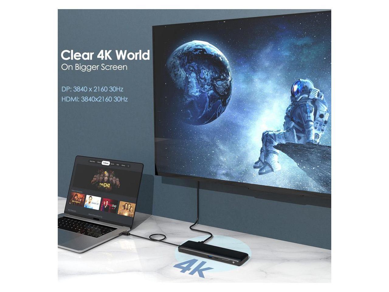 Q: Can I charge my laptop while using this docking station?A: Yes, the docking station supports Power Delivery (PD3.0) for upstream power charging, allowing you to charge your PC up to a maximum of 100 Watts while using it.