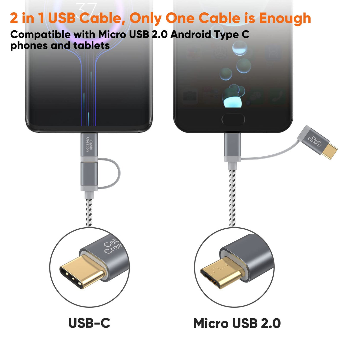 Brand Guarantee Cablecreation Focus On The Ideal Design Of All Of Our Quality Cables. Cablecreation Is Not Only A Brand But Also A Creative Team With Own Factory Manufacturing. Cablecreation Is Confident To Offer All Buyers With Items Life Time Warranty. Specifications Cablecreation 2 In 1 Micro Usb With Type C Adapter To Standard Usb 2.0 A Male Connection Cable Side A: Gold Plated Standard Usb 2.0 A Male With Aluminum Shell Side B: Gold Plated Micro Usb With Type C Adapter With Aluminum Shell Cable 100% Shielded Coverage Cable Color: Space Gray Cable Length Is 0.25 Meter Approximately 0.8 Feet