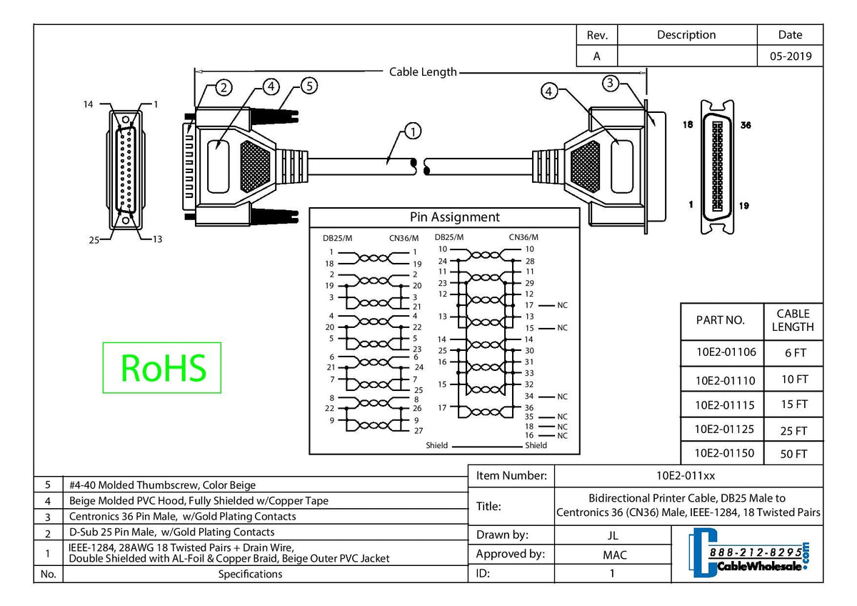 Our 25 Foot High Quality Db25 Male To Centronics 36 (Cn36) Male Bidirectional Parallel Printer Cable Features Molded Connectors And Gold Plated Contacts For Superior Corrosion Resistance Ensuring A Solid Connection For The Life Of The Cable. The Cable Sports 25 Conductors. This Cable Is Ideal For Connecting 25 Pin Bidirectional Printer Ports On Laptops, Computers And Expansion/Interface Cards To Printers And Devices Have A 36 Pin Centronics Bidirectional Parallel Port. This Male To Male Serial Cable Is Solidly Constructed, Ul Rated And Rohs Compliant. There Are 3 Basic Types Of Printer Connectors; Type A, Type B, And Type C. Type A Is A Db25. Type B Is A Cn36. Type C Is An Hpcn36.