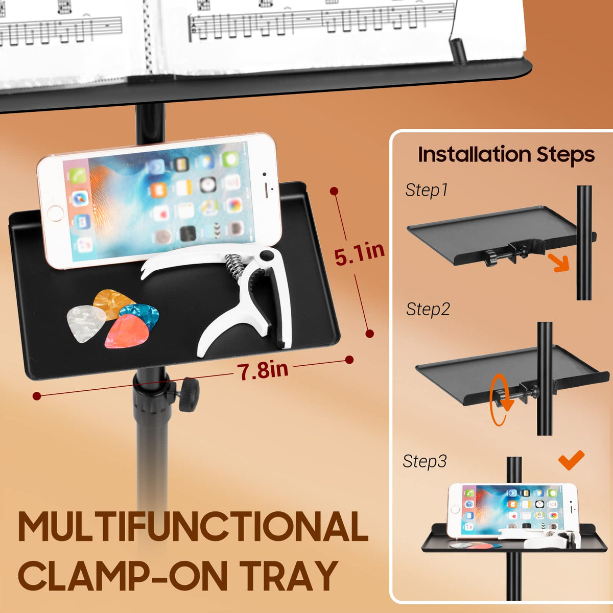 Cahaya Dual Use Sheet Music Stand With Clamp-On Tray Desktop Book Stand With Carrying Bag, Sheet Music Folder, Music Stand With Shelf, And Clip For Guitar, Ukulele, Violin Players