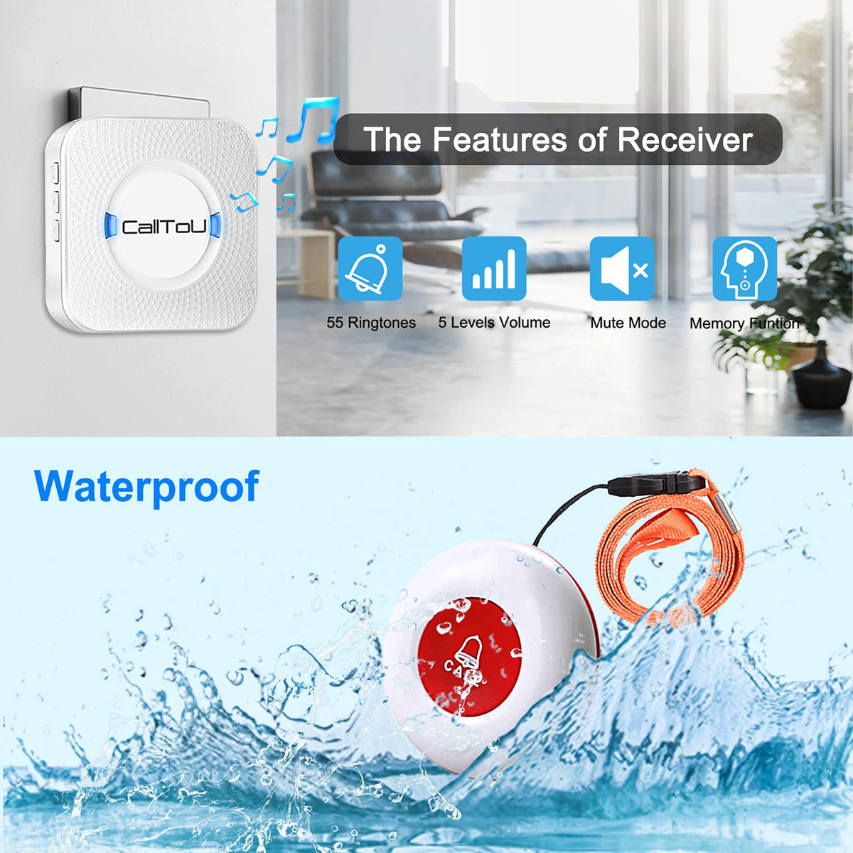 Q: Is the CallToU Caregiver Pager waterproof?A: Yes, the CallToU Caregiver Pager has an IP55 waterproof rating, making it suitable for use in various environments, including homes and offices. This feature helps protect the device from splashes and moisture.