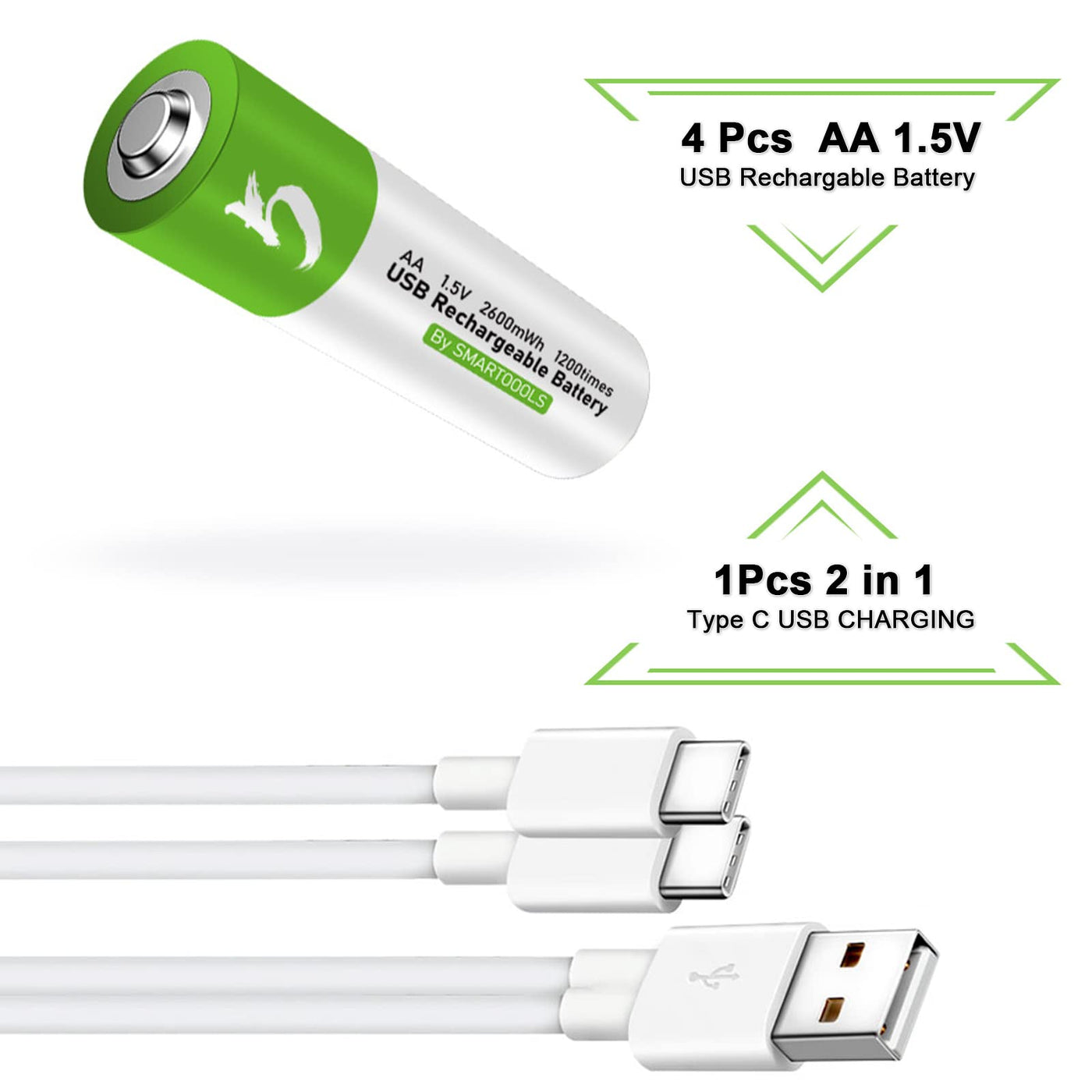 Camelcell 4 Pack Aa Batteries, Rechargeable Aa Batteries, 2600Mwh With 4 In 1 Usb Type C Charger Cable Double A Lithium Batterie