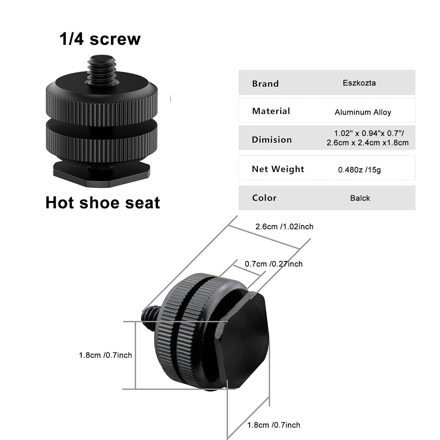 Camera Hot Shoe Mount To 1/4''-20 Tripod Screw Adapter Flash Shoe Mount For Dslr Camera Rig International Standard Hot Shoe Type That Accepts Any Standard Camera Shoe; Universal 1/4''-20 Tripod Screw On Top, Widely Used On Photography And Video Configurations; It Includes 2 Nuts Which Can Be Adjusted. The Bottom Plate Fits Securely Into Dslr/Slr Camera'S Hot Shoe And Screws Down Tightly. The Top Bolt Then Fits Into The Tripod Hole At The Rear Of The Digital Recorder And Also Screws Down Tightly. Ideal For Microphone, Led Light, Monitor To Dslr, Camcorder Or Digital Camera, Or Adapt Anything Else That Has A 1/4-20 Receptacle. Package Contents: &Nbsp;2 X 1/4'' Tripod Screw To Flash Shoe Mount Adapter