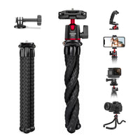 Flexible Tripod Stand With Hidden Phone Holder For Camera And Phone 2-In-1 Cold Shoe Phone Mount Design For Smart Phone And Digital Camera. Removable 360 Degree Ball Head Allows Vertical And Horizontal Shooting. 1/4 Extension Interface For Light Or Microphone. High Strength Aluminum Core,Solid And Durable.
