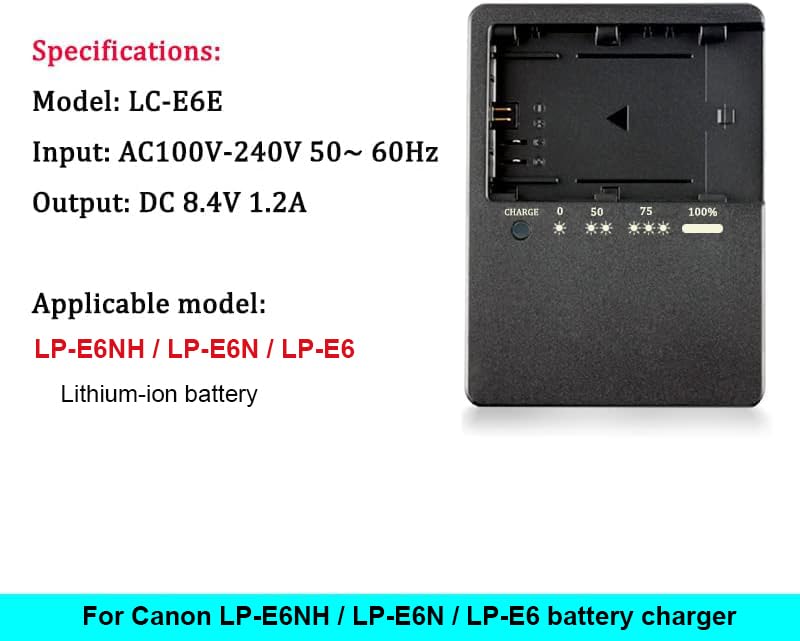 Camera Battery Charger Lc-E6E Lce6E Lc-E6 Lc E6 For Canon Lp-E6 Lp-E6N Lp-E6Nh Battery, Suitable For Eos 70D 60D 6D 7D 5D2 5D3 Features: 100% Brand New And High Quality. 8.4V 1.2A Output. 100% Full 1.2A, Fast Charging Charging Time: Lp-E6: 1800Mah ; Approximate 150 Minutes: Lp-E6N: 1865Mah; Approximate 150 Minutes: Lp-E6Nh:2130Mah. Approximate 180 Minutes: Attention: The Indicator Blinks At A Constant Frequency Throughout The Charging Process. The Indicator Turns Off When The Battery Is Fully Charged. Suitable For Canon Battery Models: Lp-E6, Lp-E6N, Lp-E6Nh Suitable For Canon Camera Models: Eos R5 / R6 / R / 5D Mark Iv / 5D Mark Iii / 5Ds / 5Ds R / 5D Mark Ii / 6D Mark Ii / 6D / 7D Mark Ii / 7D / 90D / 80D / 70D / 60D / 60Da Etc. Package Includes: (Battery Not Include ) 1 X Lc-E6 E6E Charger 1 X Ac Power Cord