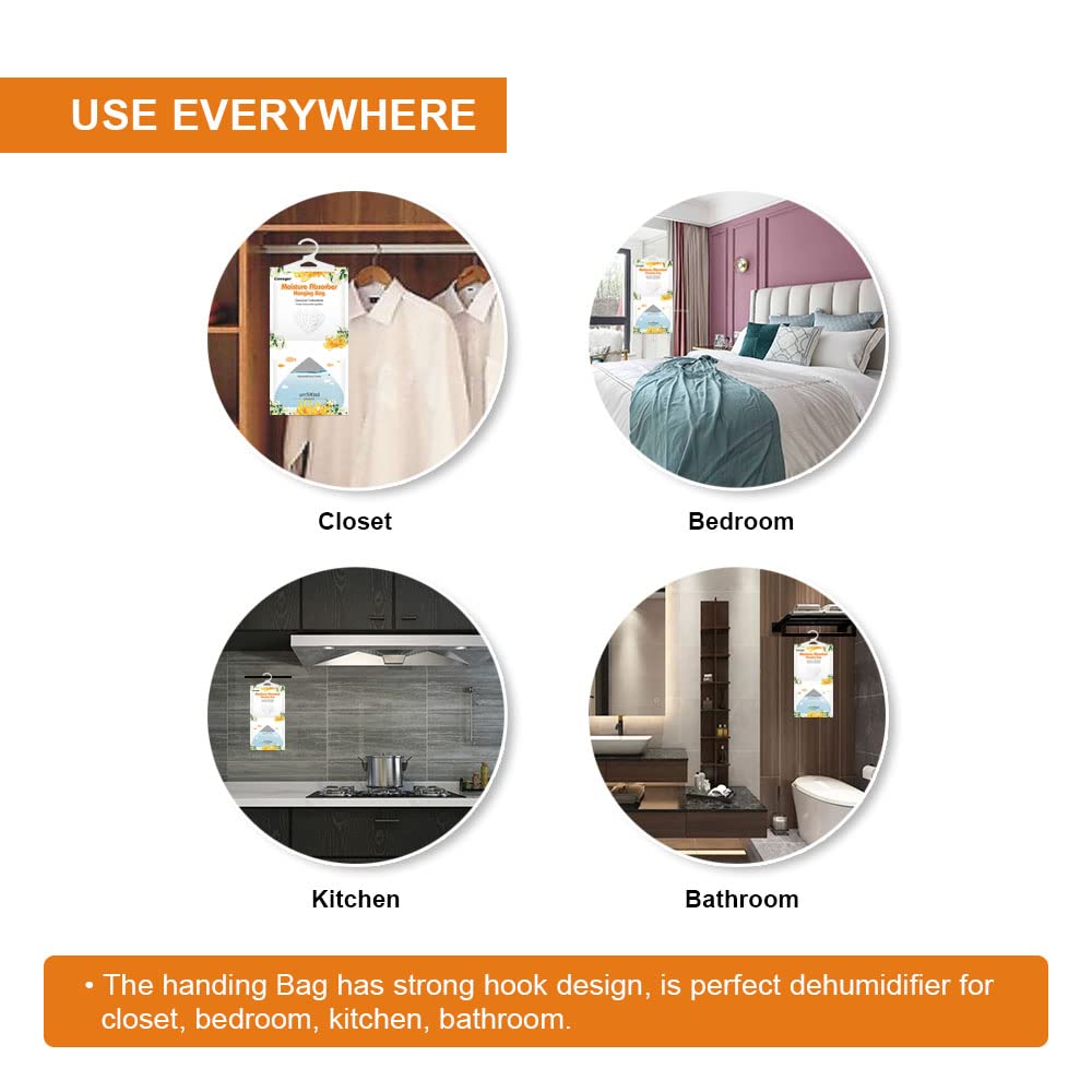The Hanging Moisture Absorber Bag Can Effectively Absorb The Excess Moisture In The Air, Eliminate The Peculiar Smell As An Air Freshener, And Keep The Air Fresh In The Place,Jasmine Calendula | Canager Dehumidifier Bag Can Directly Drop The Collected Moisture Into The Transparent Collection Bag, And Can Clearly Observe The Dehumidification State At Any Time To Create The Best Humidity Environment. | The Multi-Purpose Hanging Bag Design Is Very Suitable For Families And Enclosed Spaces, Such As Closets, Laundry, Boats, Basements Or Rv Closets, To Solve The Moisture Problem In These Places. | When In Use, It Only Needs To Be Hung In The Required Area, And Enough Space Needs To Be Reserved For Air Circulation. Crystals Will Gradually Melt And Gather Together. After They Are Finally Completely Dissolved, The Excess Water Falls Into The Collection Bag. Just Discard And Replace. | Canager Fragrance Moisture Absorber With Physical Dehumidification Process Has No Pollution To The Environment.