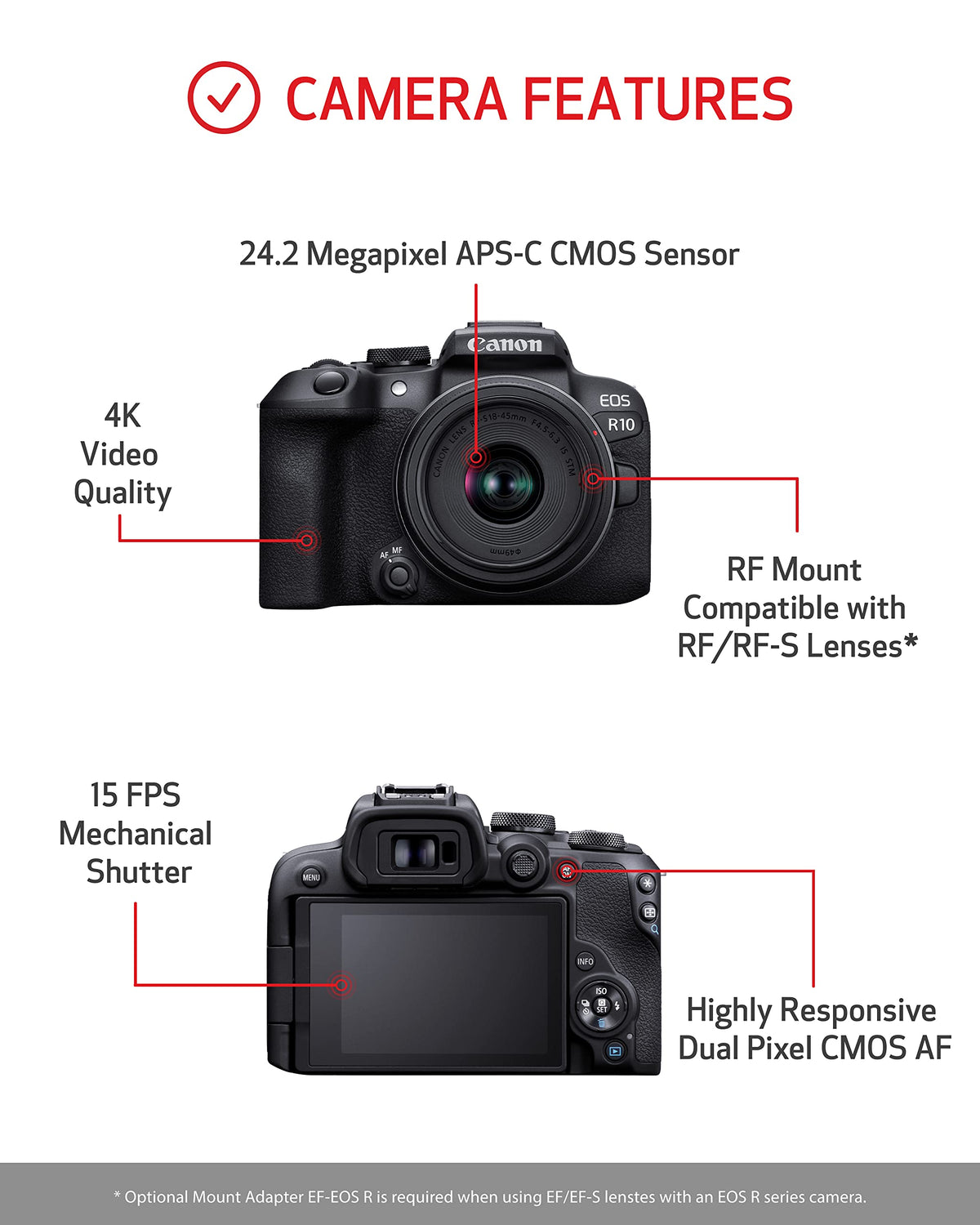 Canon EOS R10 Mirrorless Camera RF S18 45mm F4.5 6.3 is STM Lens Kit, Hybrid Camera, 24.2 Megapixel CMOS (APS C) Sensor, 4K Video, Vlogging Camera for Content Creators, Black